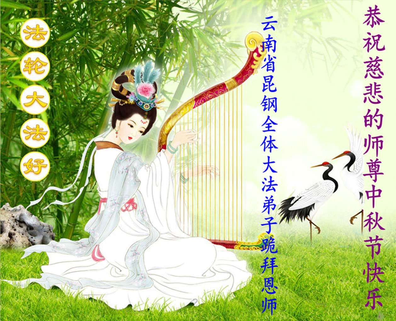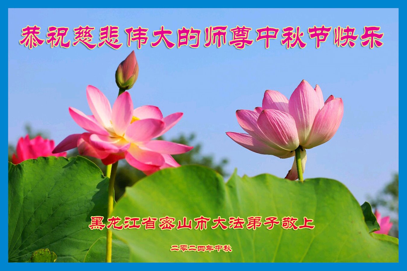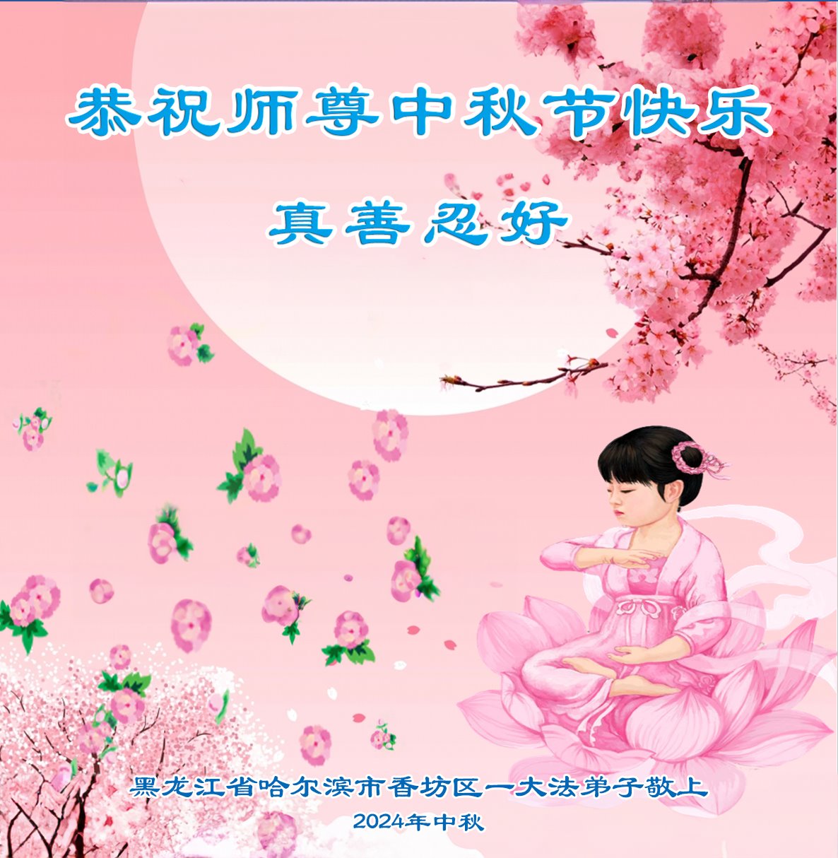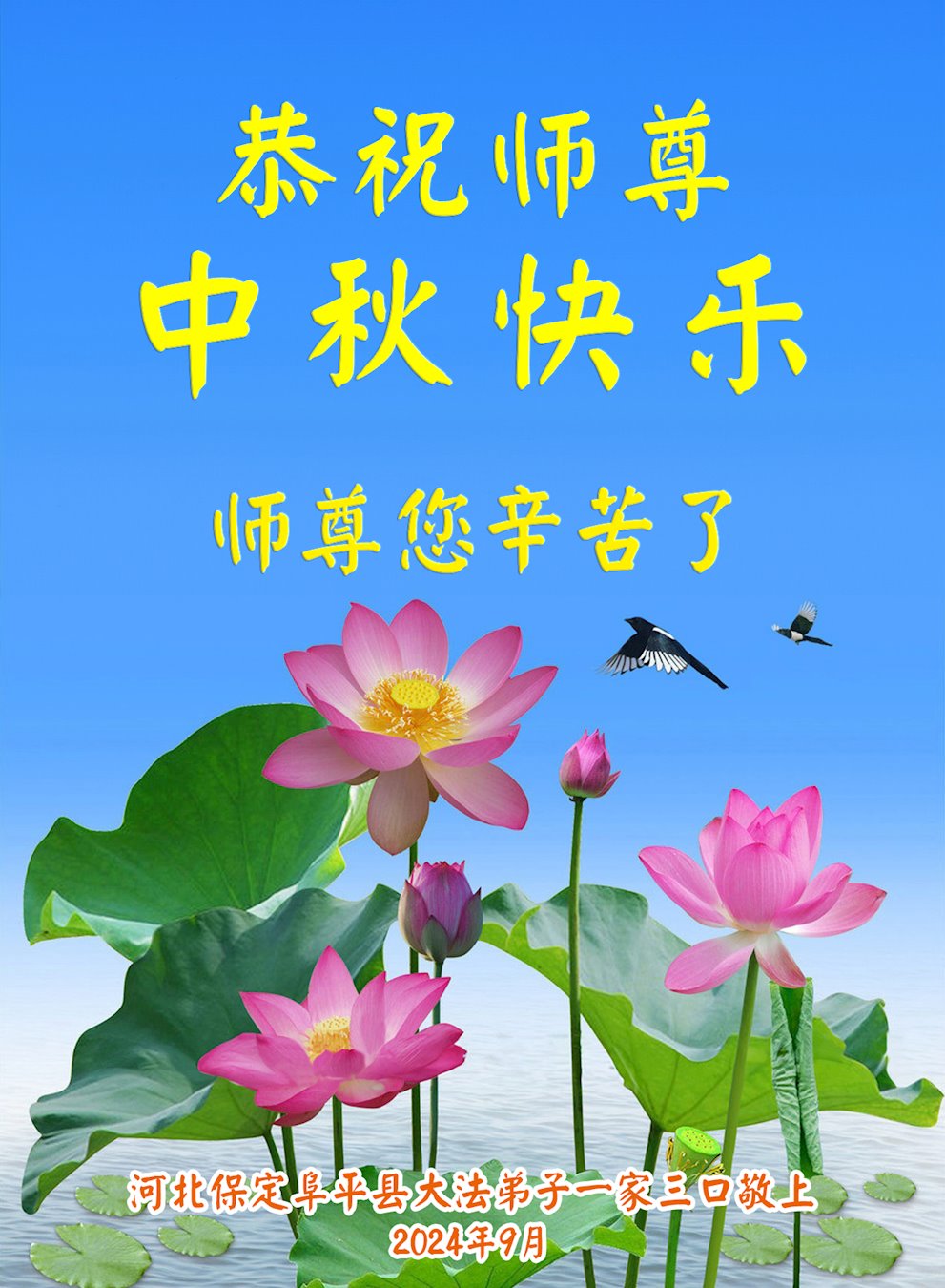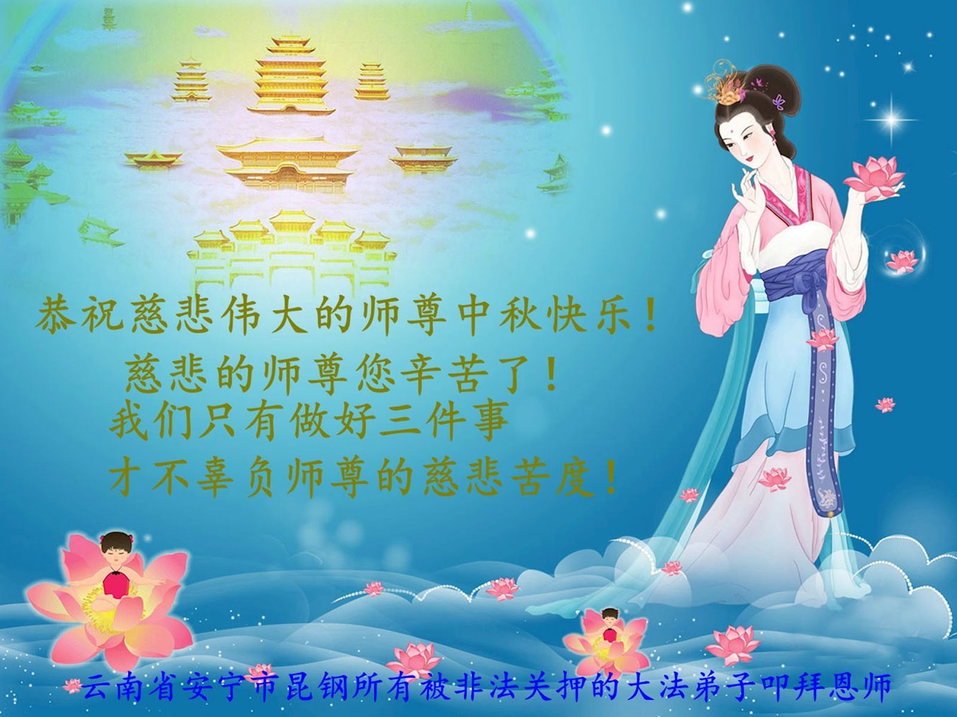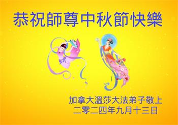 弟子和家人同修恭祝师父中秋节快乐!感恩师父对弟子和家人同修的一路慈悲看护!弟子也感恩师父对弟子的一切慈悲安排!弟子一定努力多学法炼功,用心做好救人的事情,修去妒嫉心,怨恨心,及人心,人念,人情,努力做好师父让弟子做的救人的事,跟随师父回家!