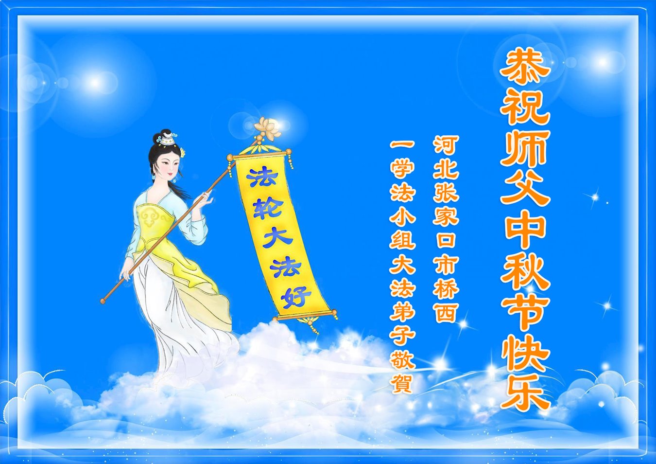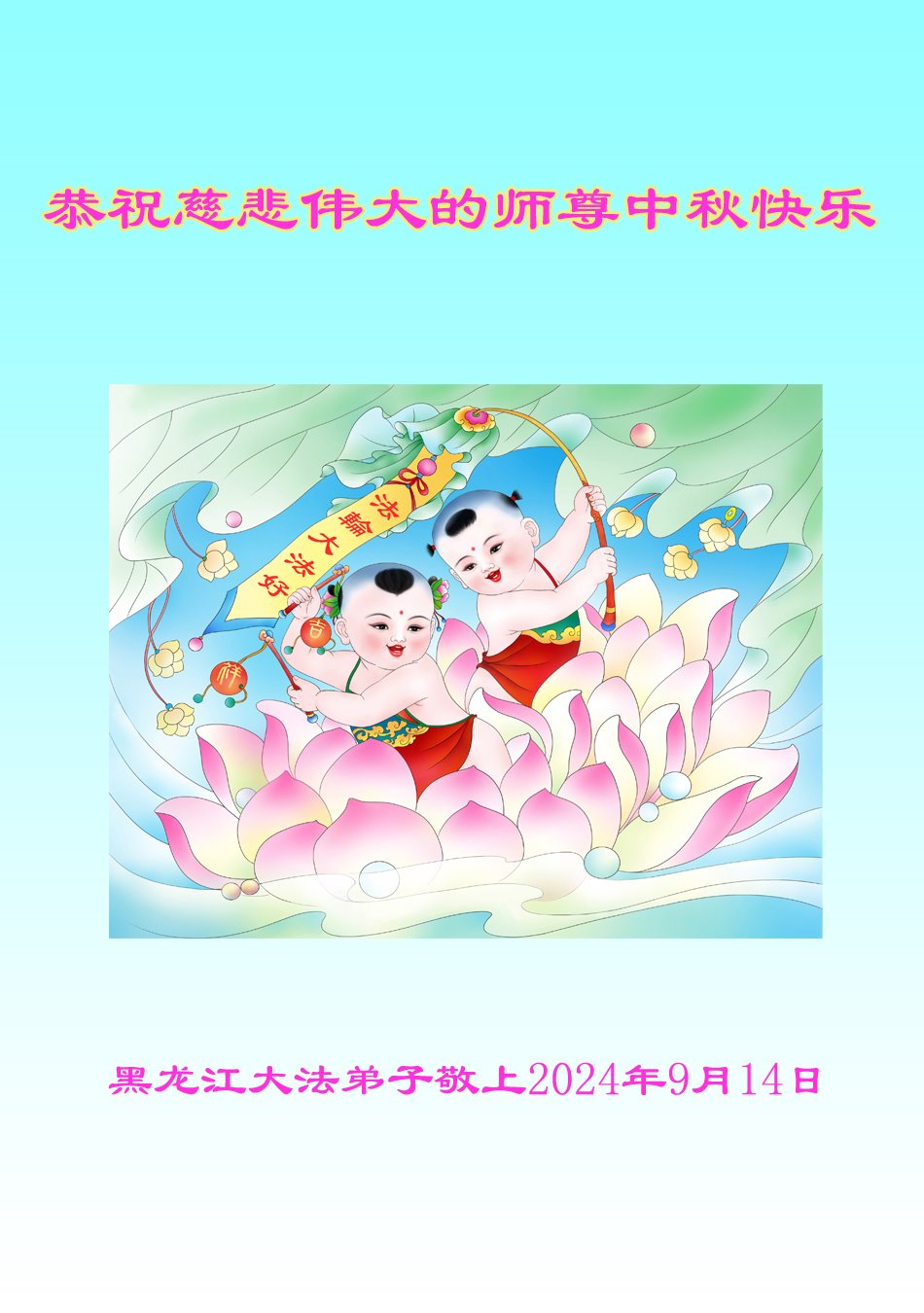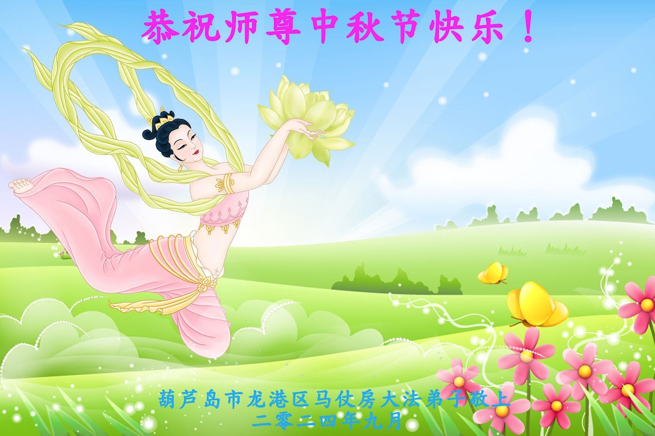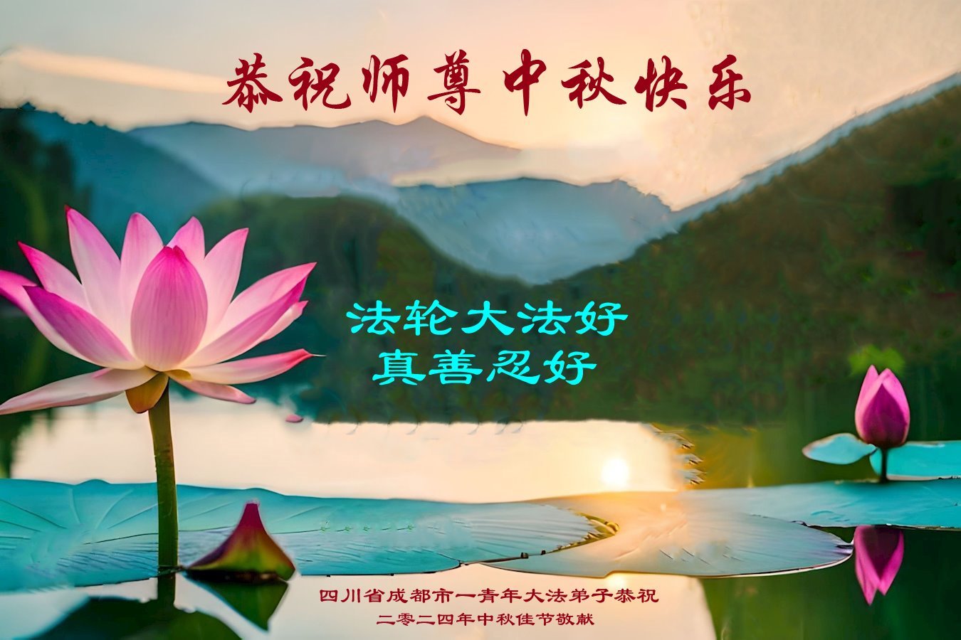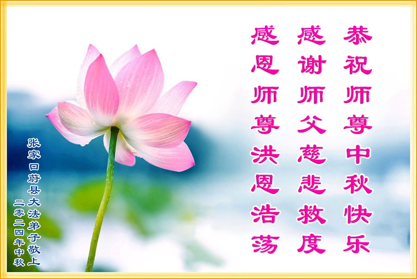 弟子和家人同修恭祝师父中秋节快乐!感恩师父对弟子和家人同修的一路慈悲看护!弟子也感恩师父对弟子的一切慈悲安排!弟子一定努力多学法炼功,用心做好救人的事情,修去妒嫉心,怨恨心,及人心,人念,人情,努力做好师父让弟子做的救人的事,跟随师父回家!