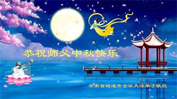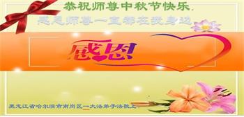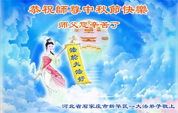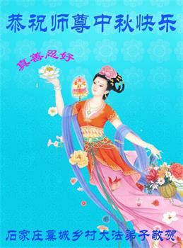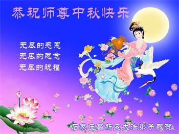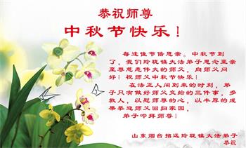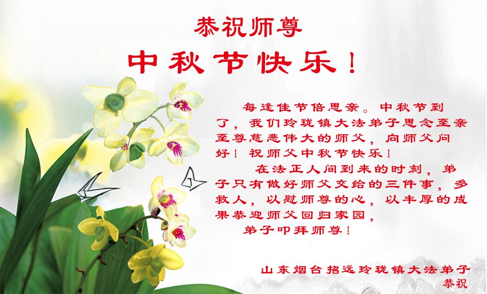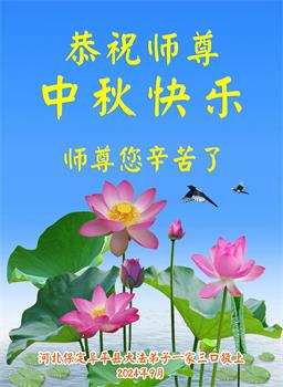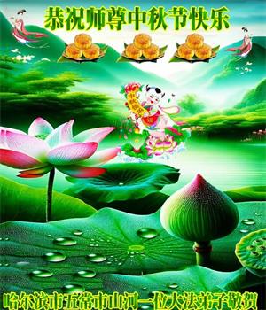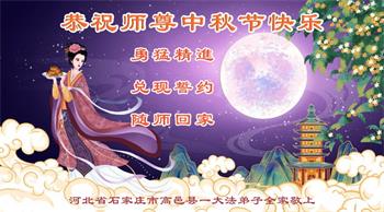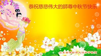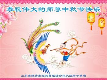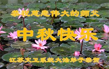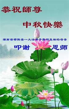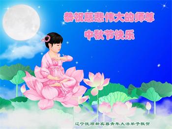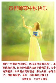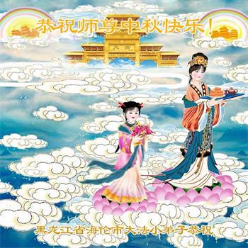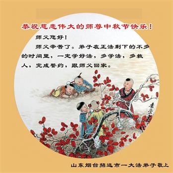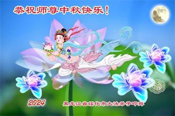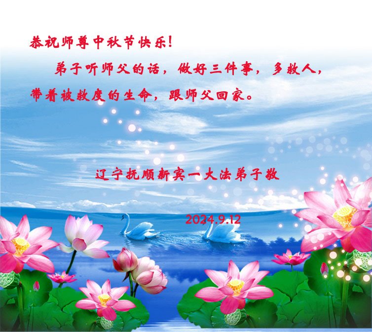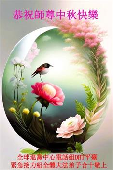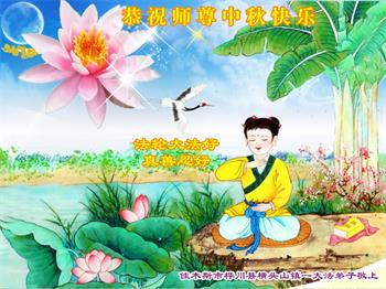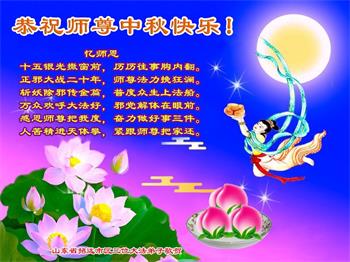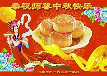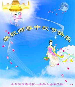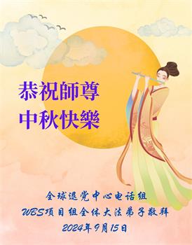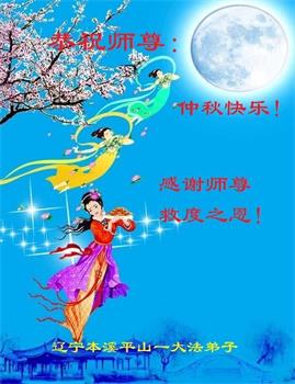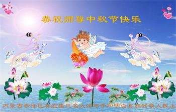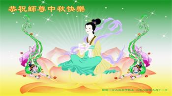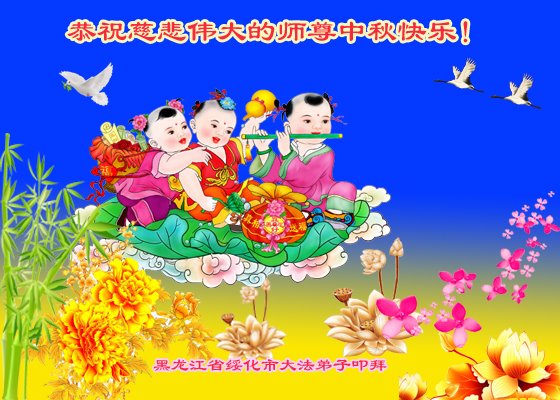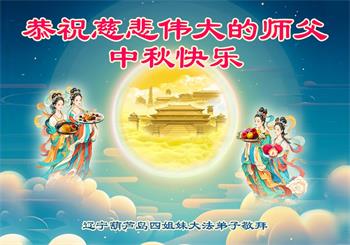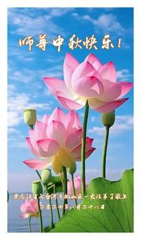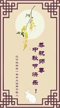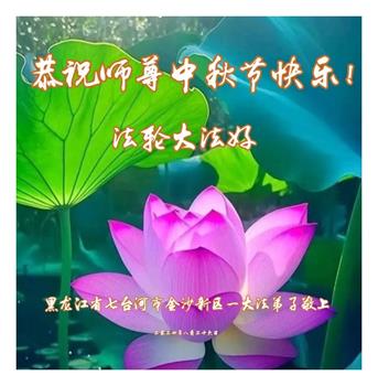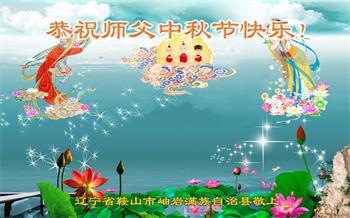 越修炼到最后,越想念师尊,恭祝师尊中秋节快乐!我每天都听师父的话,忙着打电话讲真相,多年来白天打营救电话,晚间劝三退,每天乐呵呵地,和同修配合的非常好。感激师父的加持!弟子今后要救度更多众生,完成师父赋予的历史使命,高高兴兴地跟师父回家。