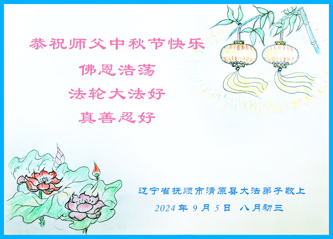 【明慧网二零二四年九月十七日】在甲辰中秋节之际,一张张飞出牢笼的贺卡诉说着在中国大陆身陷囹圄的大法弟子的心声:“禁锢的高墙也阻挡不了我们对师尊的问候、想念、祝贺!”“弟子们一定坚信师尊,在邪窝里坚持劝三退救人。”“环境再恶劣、迫害再邪恶,我们都坚信:正义光明的一天一定会到来。”