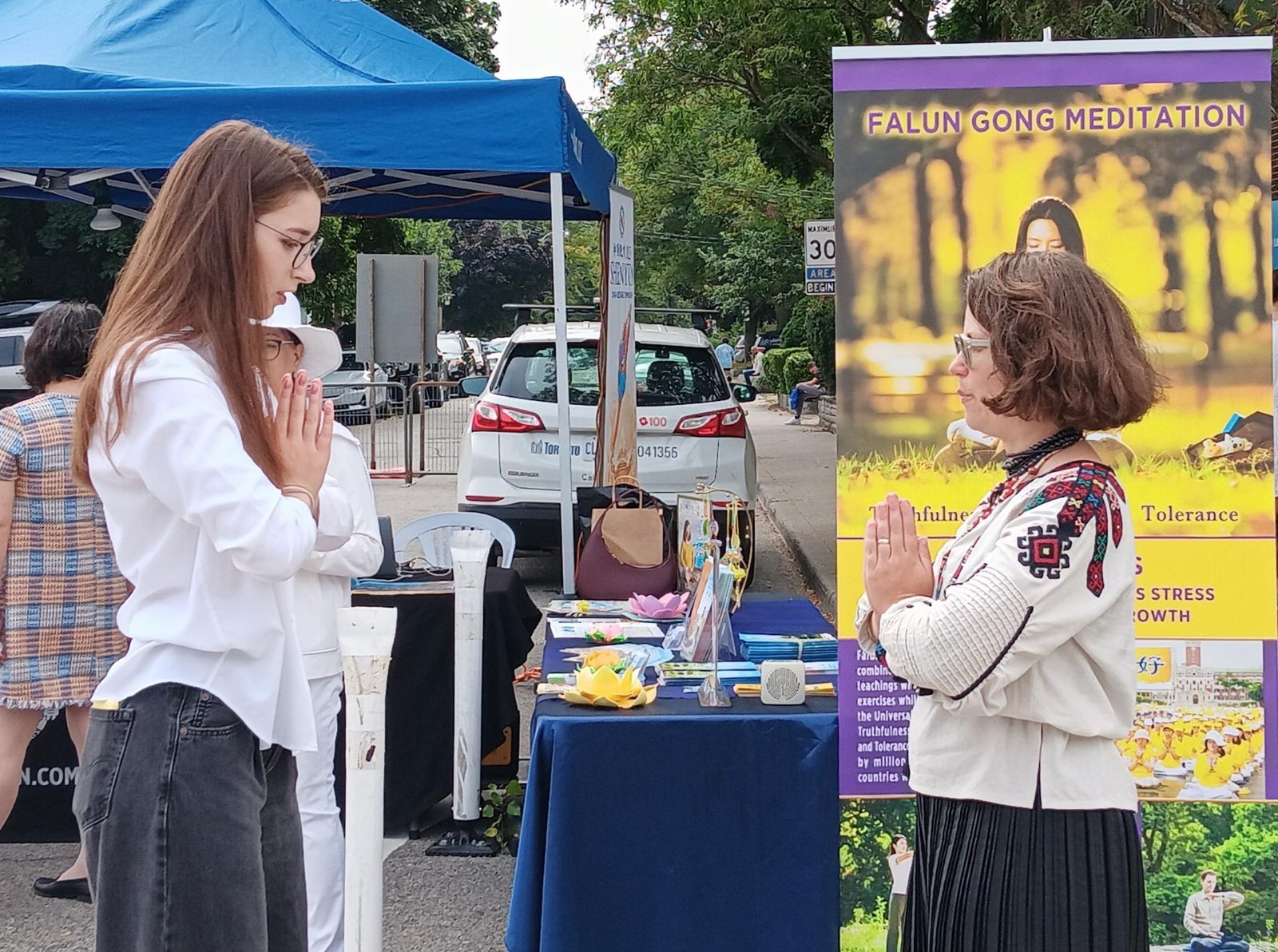 安朱(Anju)和她的丈夫来自印度,她曾从事金融服务工作,现在定居在加拿大。他们在展位前驻足,她丈夫对学员说:“我知道法轮功起源于中国,但是现在在中国被禁止了。我认为这场迫害是不合理的。”听完丈夫所讲的内容,安朱表示自己对功法产生好奇,于是学员介绍了功法的基本情况和相关书籍。