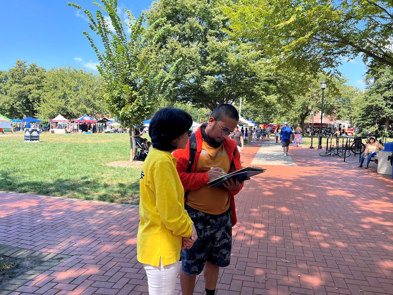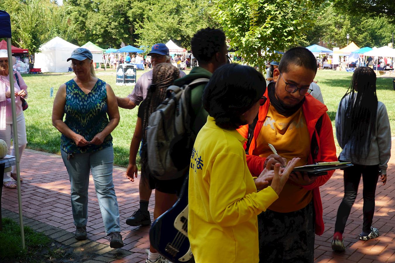图4~10:法轮功学员在特拉华州纽瓦克社区日活动中向民众讲真相,民众听闻后纷纷在反对活摘器官征签表上签名表示支持。