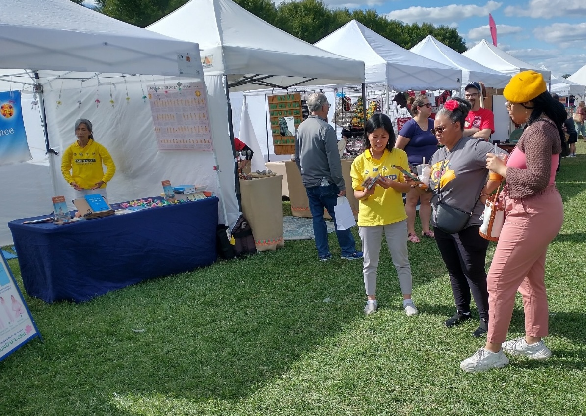 一位女士和她女儿来到展位。学员介绍了这是佛家上乘修炼大法,以宇宙最高特性“真、善、忍”为根本指导,按照宇宙演化原理而修炼。五套功法简单易学。可起到解除压力, 提高身心健康的作用。她说她很想练习打坐,但一直没有时间,当听说当地有炼功点, 可免费学习,她很高兴。并说自己住在炼功点很近的地方,会带她先生一起去。她的女儿学过一年中文,对中国文化有些了解。明白法轮功真相后,她们还拿到了学员们赠送的手工莲花。现场气氛喜悦、祥和。