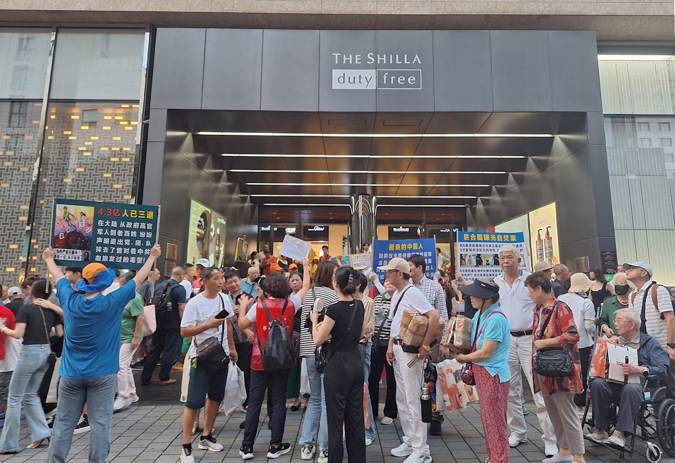![]() 图1~2:在乐天免税店前,中国游客们驻足阅读法轮功真相展板。 |