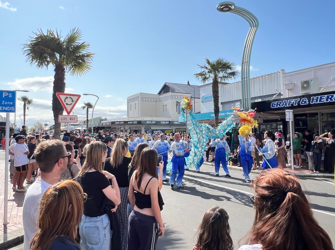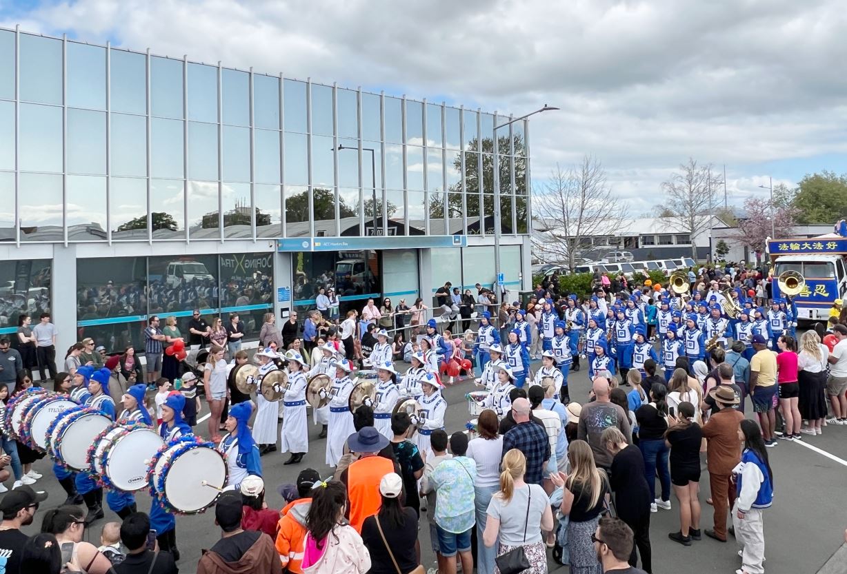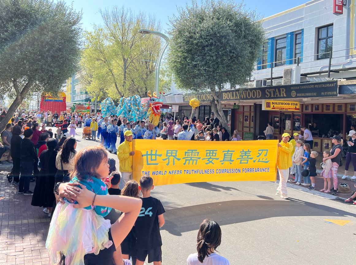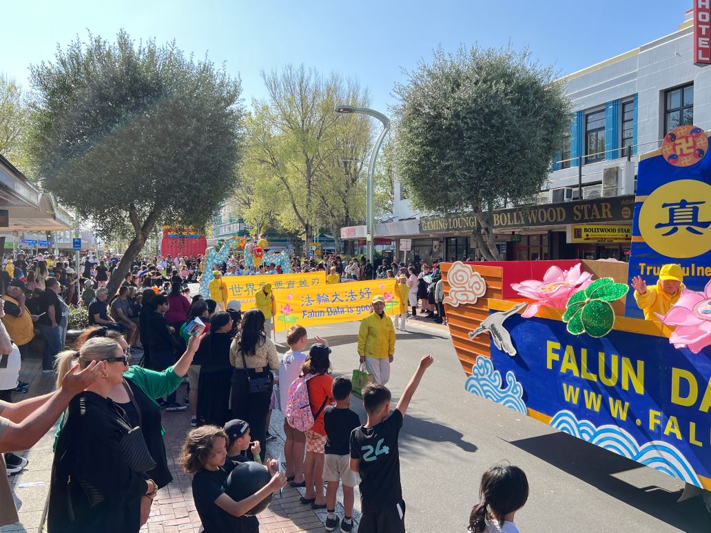 下午一点,游行正式开始。黑斯廷斯的主要商业街已经挤满了人,上万人都在翘首期盼。由法轮功学员组成的天国乐团身着蓝白相间的传统服饰,雄壮的乐曲让人们耳目一新;舞龙队灵动的表演让人目不暇接,赢得人群的阵阵喝彩;花车上中英文印着的“真、善、忍”是他们最愿意分享给社区的理念。