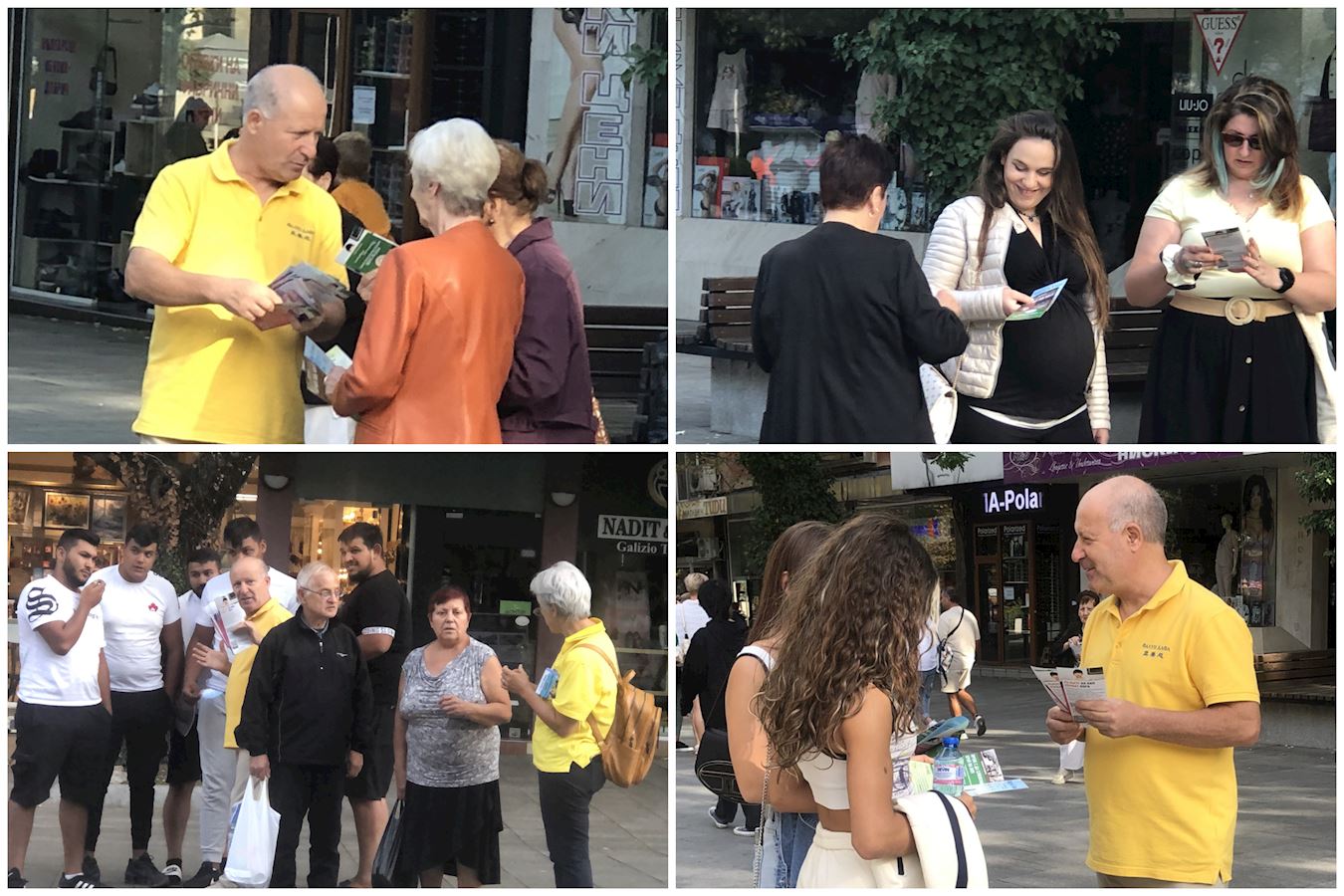 旧扎戈拉又名“椴树和笔直街道之城”,拥有两千五百多年的历史,是罗马帝国的遗址,温和的气候和优越的地理位置,使其成为热门旅游目的地。来自扬博尔(Yambol)、切佩拉雷(Chepelare)和佩什泰拉(Peshtera)的部分法轮功学员在此设立展位向民众揭露中共对法轮功学员的迫害、以及中共活摘器官的真相;同时他们还向民众展示法轮功五套功法,弘扬法轮大法的美好。轻柔的音乐和舒缓流畅的动作吸引着路过的人们,他们纷纷驻足了解真相并支持学员反迫害。