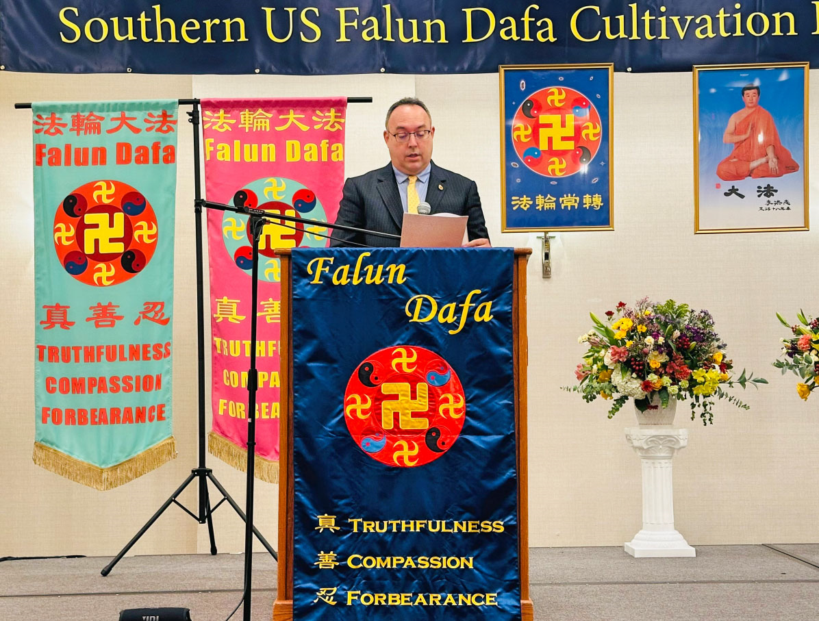 她分享了一个同修们整体配合向VIP讲真相的例子。有一年本地举办了法轮大法日集体炼功和弘法活动,新唐人媒体制作了短片。某议员的助手由最初的敷衍,到听闻真相后善良的一面受到触动,最后看完短片后明白了法轮功学员都是善良的好人。后来彭女士得到了与议员会面的机会,当时恰巧有位曾经在国内遭受过迫害的同修从德国来到休斯顿,于是他们六人一起向议员讲了真相。第二年这位议员在DC的“七·二零”反迫害集会上做了非常正义的演讲,此后还多次发声并共同签署了国会343号决议案。