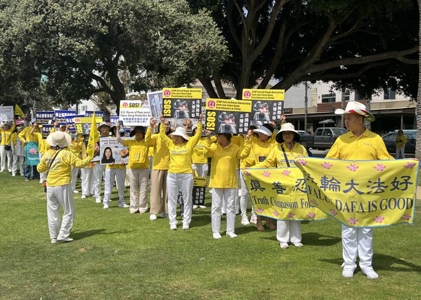 图1:洛杉矶部分法轮功学员在圣莫妮卡(Santa Monica)海滩边举行集体炼功。