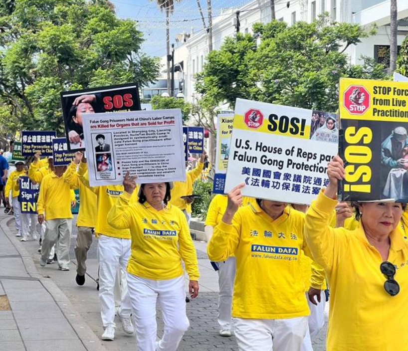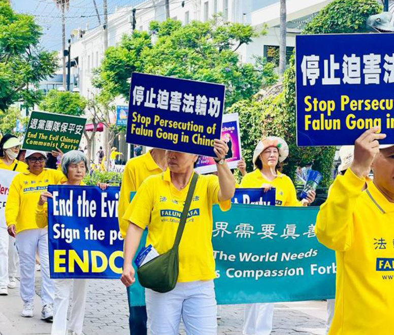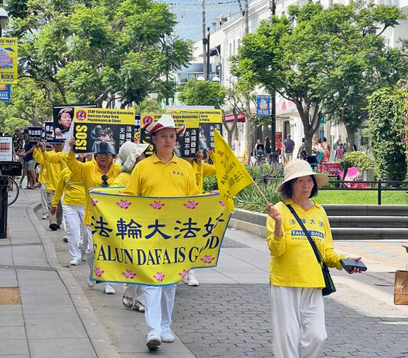 学员齐聚在圣莫妮卡(Santa Monica)码头及商业区街道举行游行,穿着金黄色衣服的学员就像一道靓丽的风景线,向来自世界各地的人讲真相,许多游客竖起大拇指,表示很震撼,也有不少游客拿出手机拍照、录像。