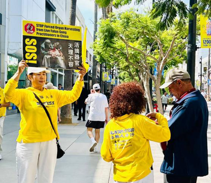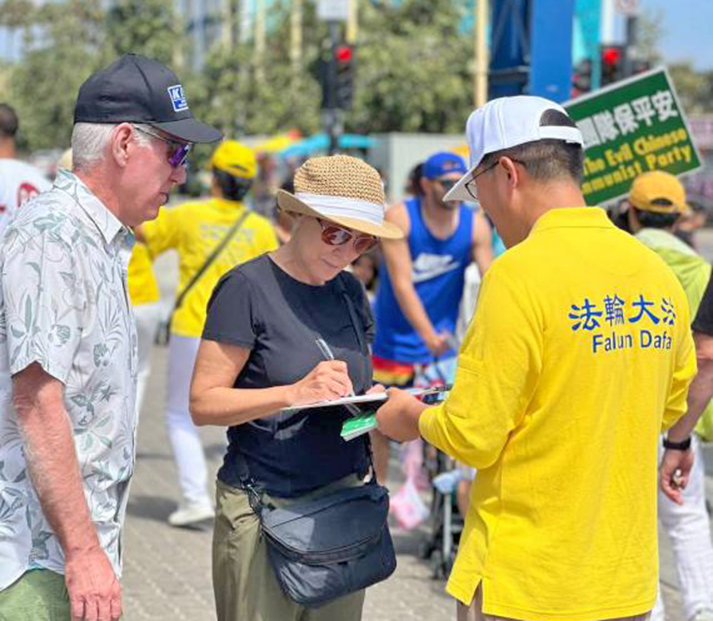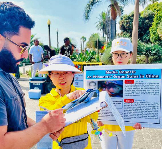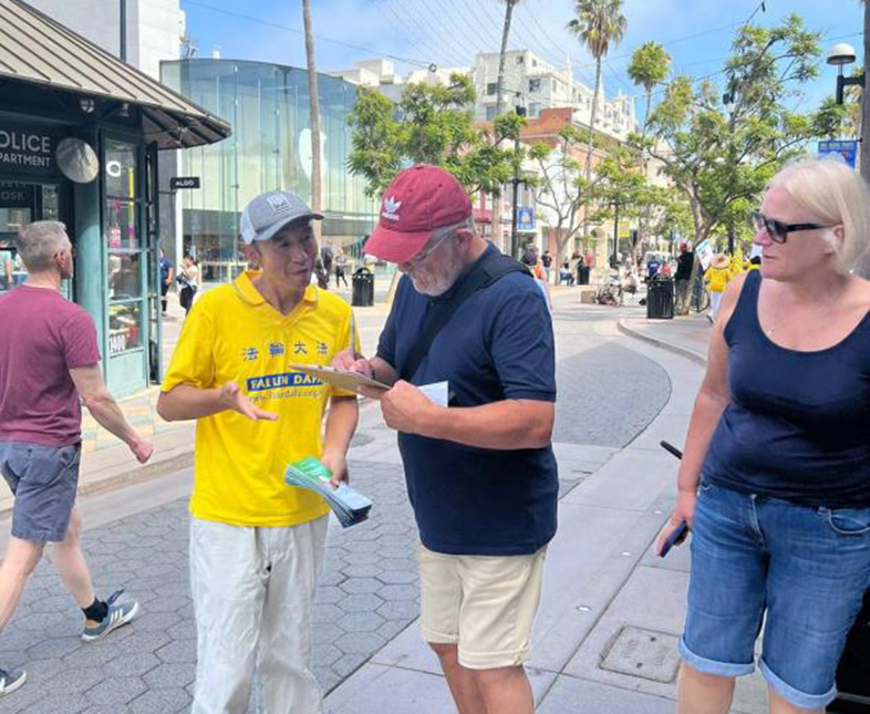 【明慧网二零二四年九月五日】现在正值旅游旺季,美国加州圣莫妮卡(Santa Monica)海边人潮涌动。每个周日在圣莫妮卡海滩都会出现法轮功学员的身影,他们向来自世界各地的游客讲述法轮大法美好的真相,揭露中共迫害法轮功的真实情况,许多明白真相的市民纷纷在反迫害请愿书上签名支持法轮功。