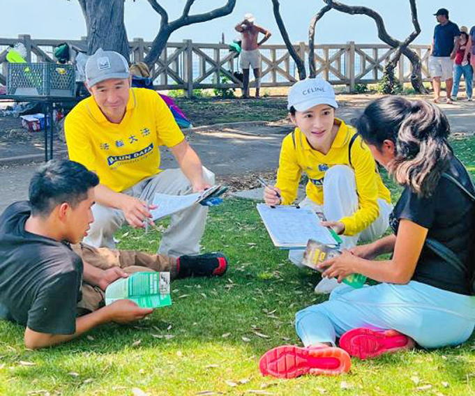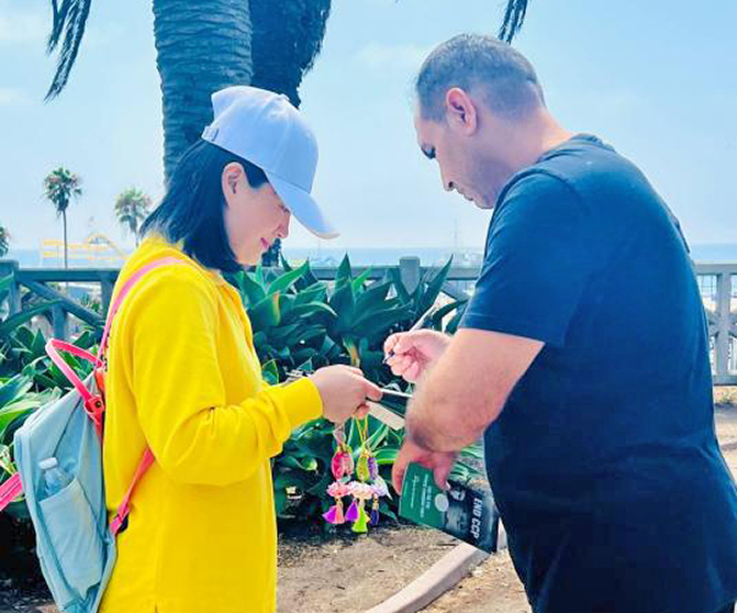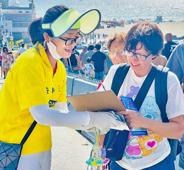 二零二零年从中国来到美国的胡女士,从开始听到法轮功就害怕,到明白真相后走入修炼,现在周末只要有时间,就会带着她的儿子来海边参加弘法和征签,她的儿子是她的小翻译。