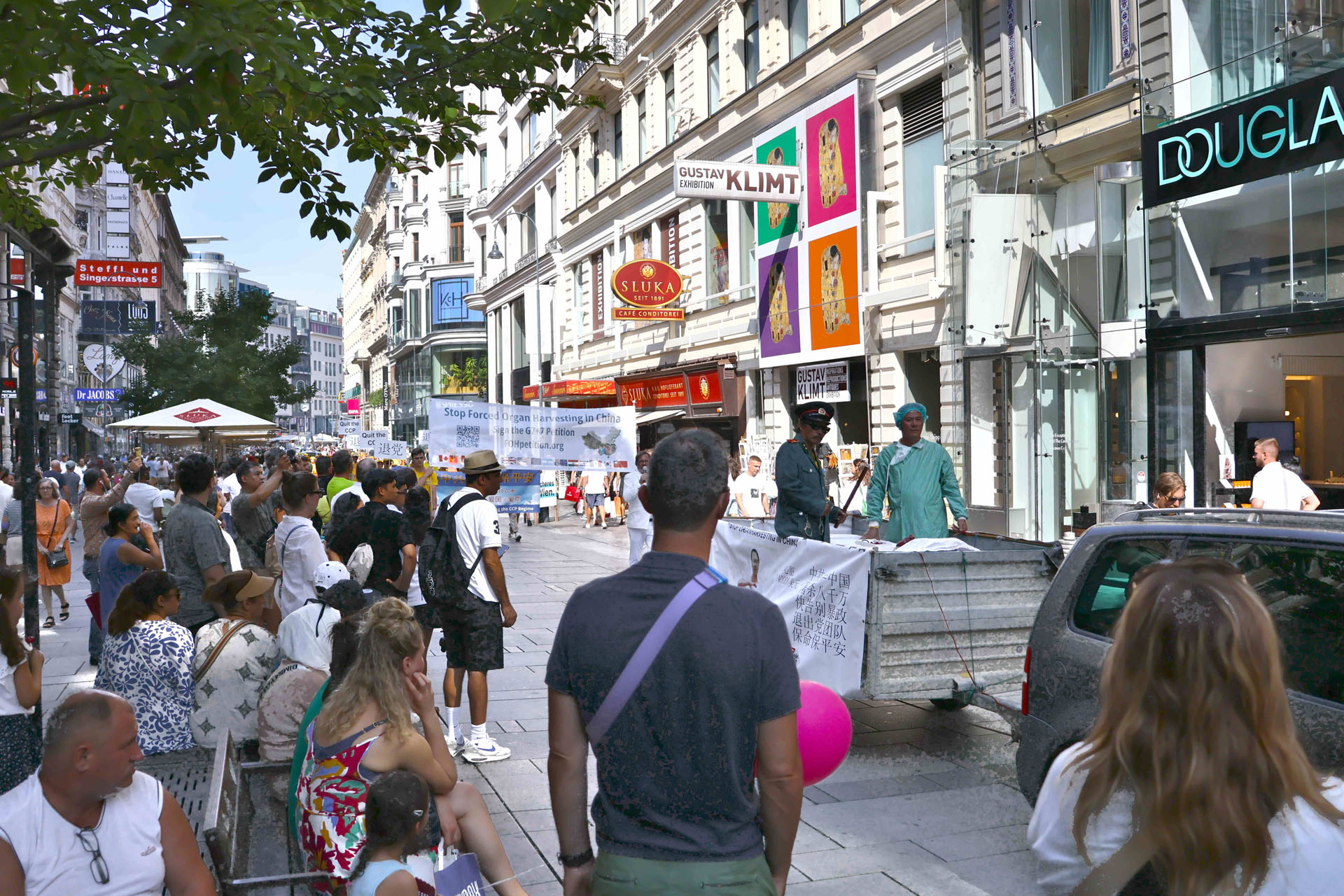 这是来自欧洲各地的法轮功学员在维也纳举行的传播真相大游行。游行从著名的斯蒂芬广场(Stephansplatz)开始,途径市中心诸多繁华的购物大街,包括克恩滕大街(Kaerntner Strasse),玛利亚希尔夫大街(Mariahilfer Strasse)及格拉本大街(Der Graben)等。