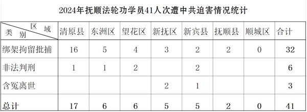 【明慧网二零二五年一月十五日】(明慧网通讯员综合报道)据明慧网资料获知,辽宁抚顺市法轮功学员在二零二四年间遭受中共迫害至少41人次,被绑架拘留批捕32人,离世3人、诬判6人其中4人被法院非法罚款46000元。