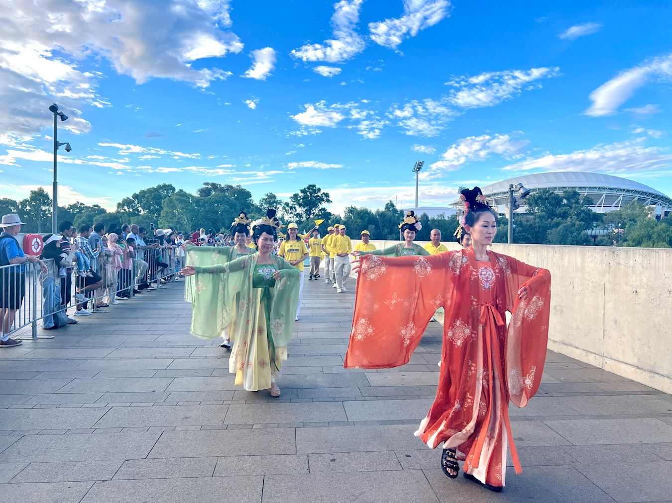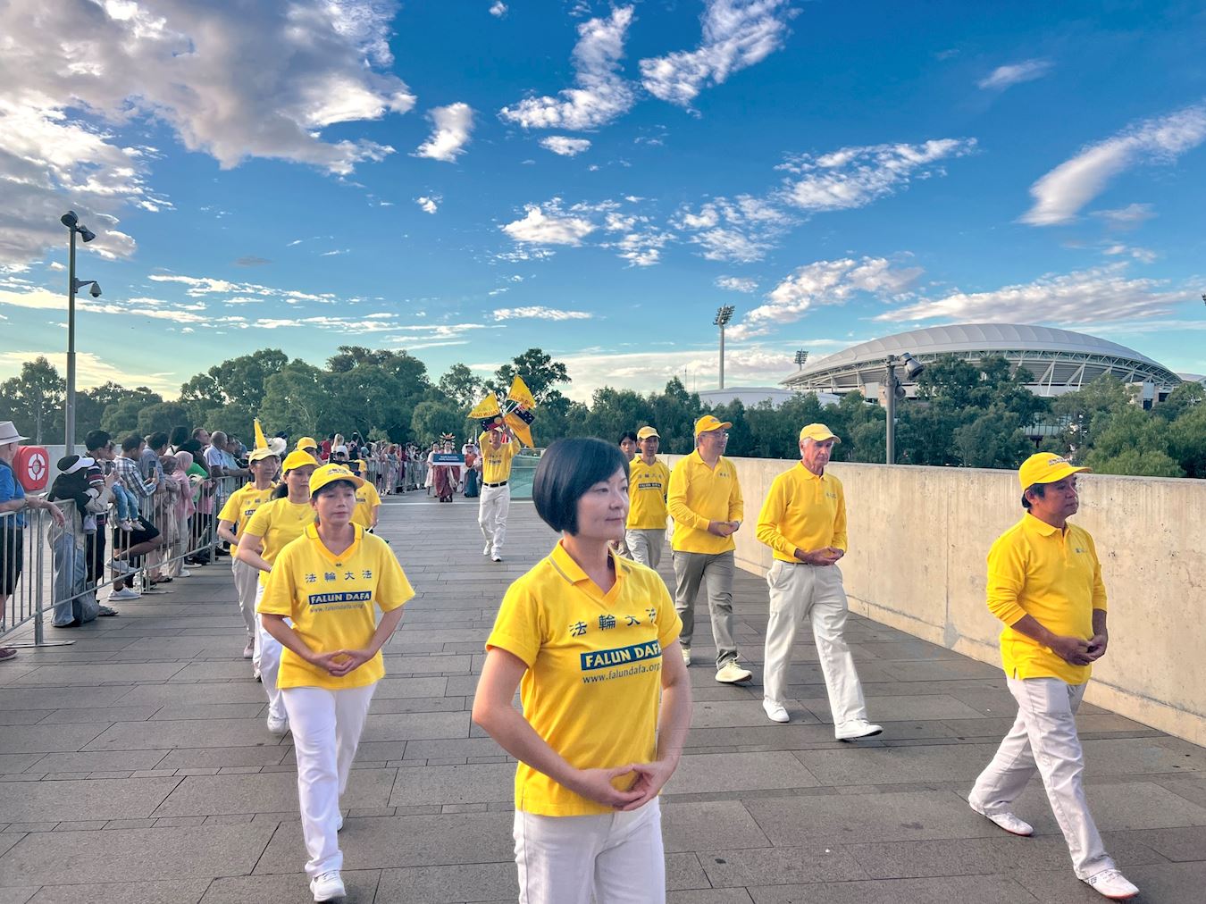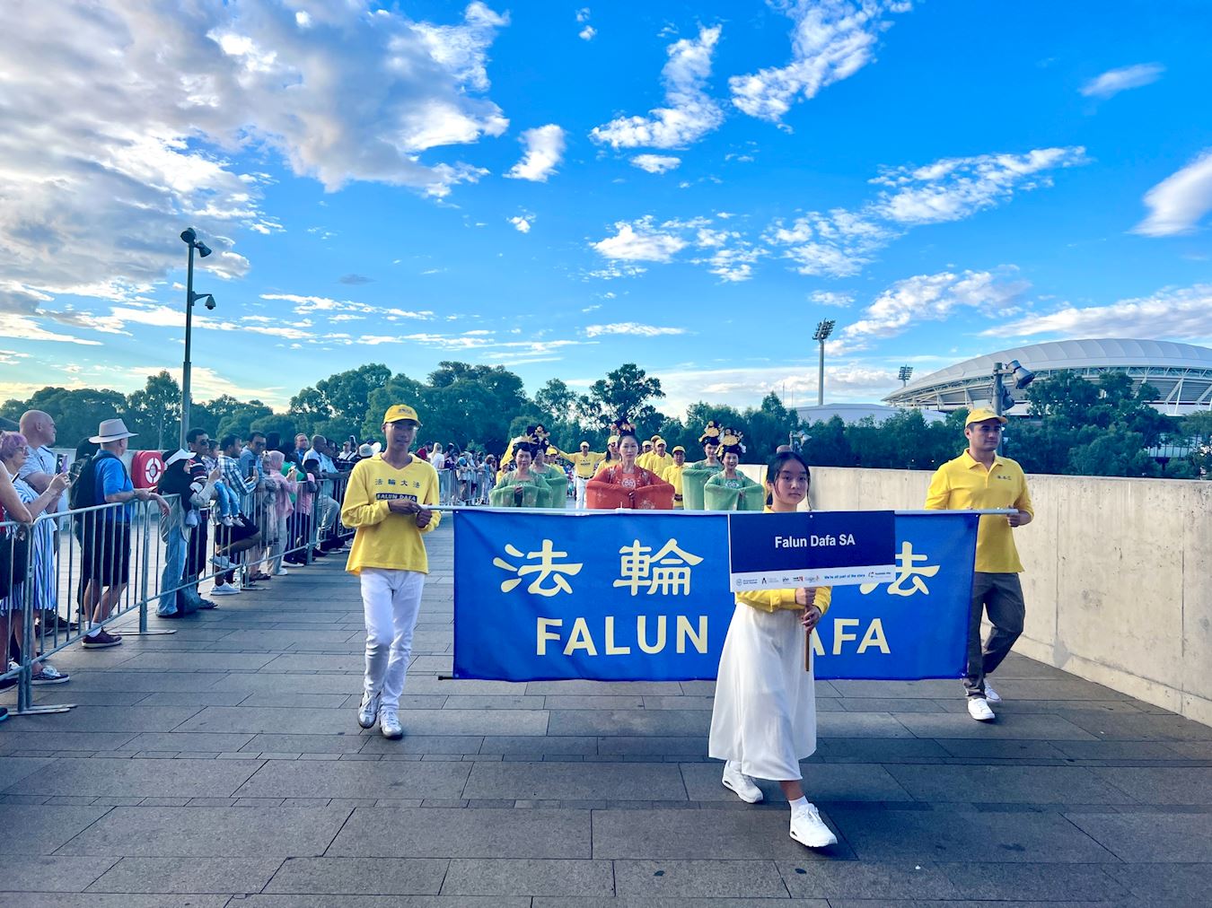 游行队伍从椭圆体育场出发,延连结著名的节日剧场的天桥到达艾德尔公园(Elder Park)庆典场地,当介绍到法轮功队伍时,众人鼓掌欢呼。