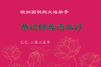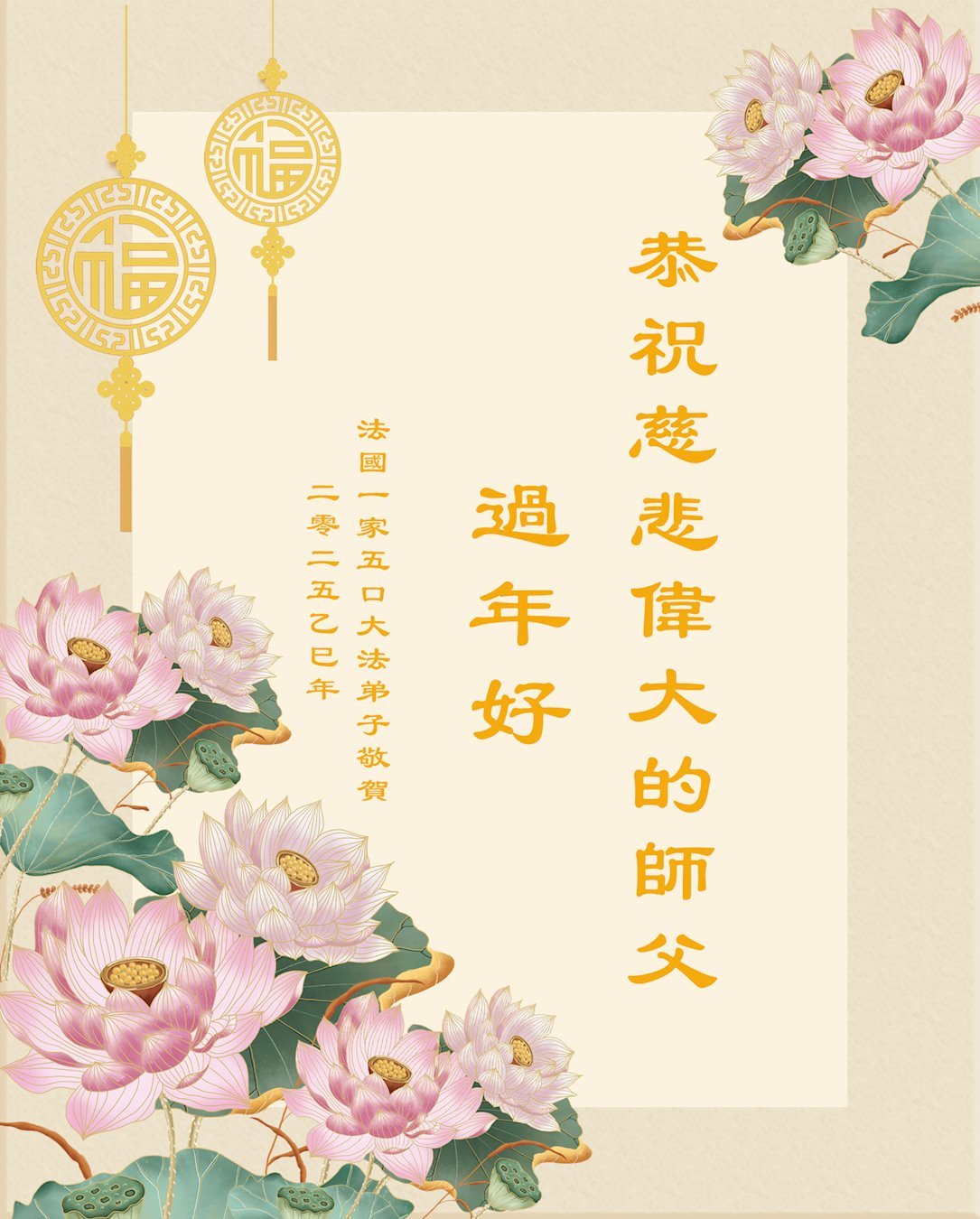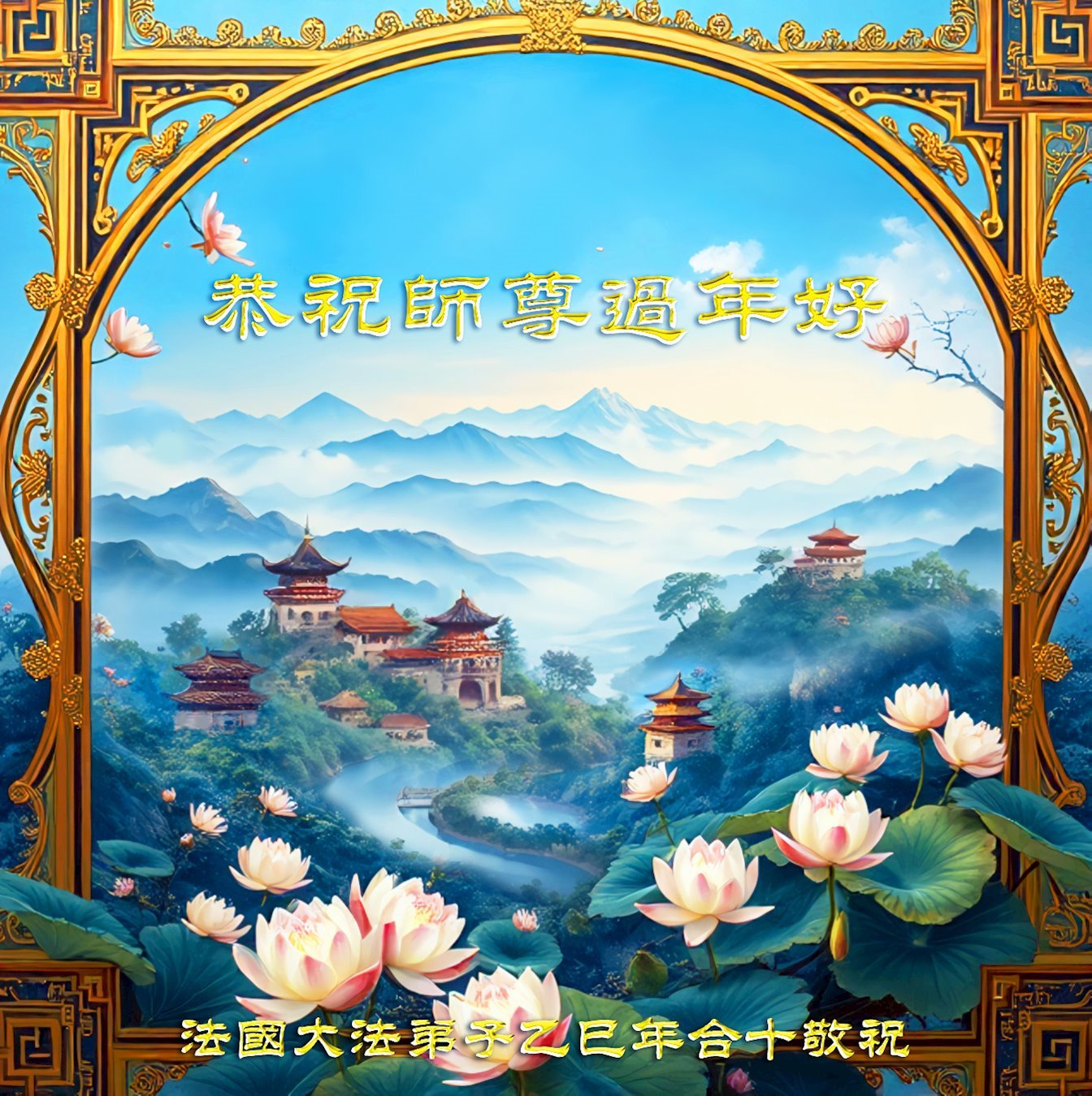尊敬的师父您好!在师尊救度苍宇、法正洪穹的伟大正法中,乙巳年到来了。值此天地归正,辞旧迎新之际,法国大法弟子在无限感恩中向慈悲伟大的师父拜年,恭祝师尊新年快乐!
