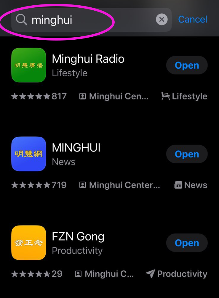 目前已有的智能手机明慧APP有:明慧网、明慧广播电台、发正念钟声、英文明慧网。中文明慧网的APP均可用“minghui”或者"明慧网"(正体、简体均可)这个关键词,在苹果或谷歌商店搜索到。
