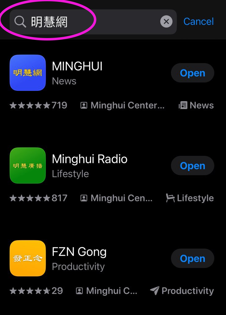 安装“明慧网”APP的方法:用手机打开苹果商店(App Store)或谷歌商店(Play Store),用关键词“minghui”或“明慧”搜索,即可看到蓝色“明慧网”APP。点击下载即可,非常简单。