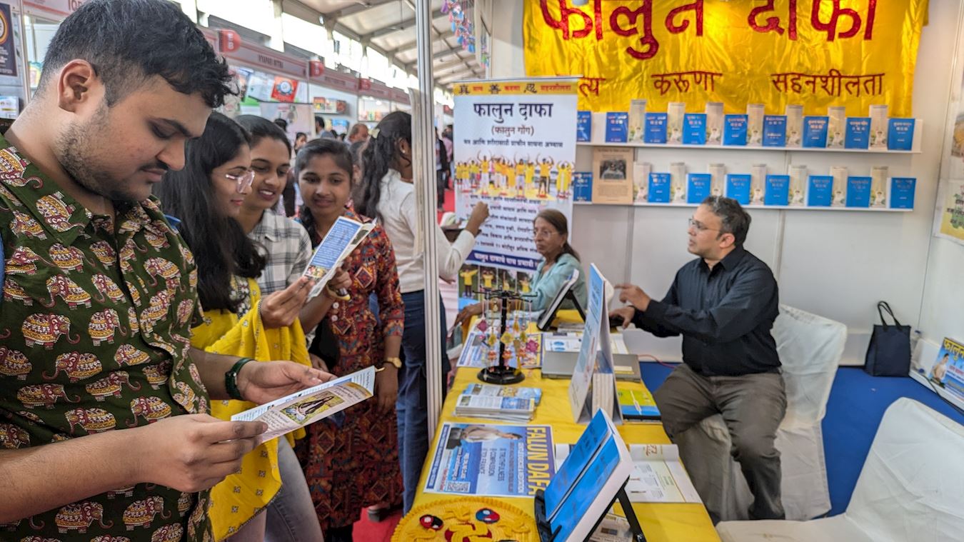 当地的一位出版商和他的工作人员在法轮大法展位的对面摆设展位,他们每天与学员交谈互动,并赞扬法轮功学员们付出的努力。他们的经理赫曼特·贾达夫 (Hemant Jadhav) 说,他“总能在法轮大法展位找到平和与宁静的环境”。