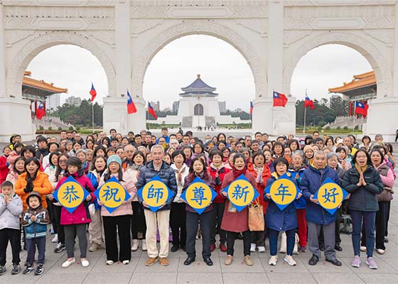 台北部分法轮功学员于二零二五年元旦清晨,来到中正纪念堂自由广场前集体炼功,并恭祝李洪志师父新年快乐。