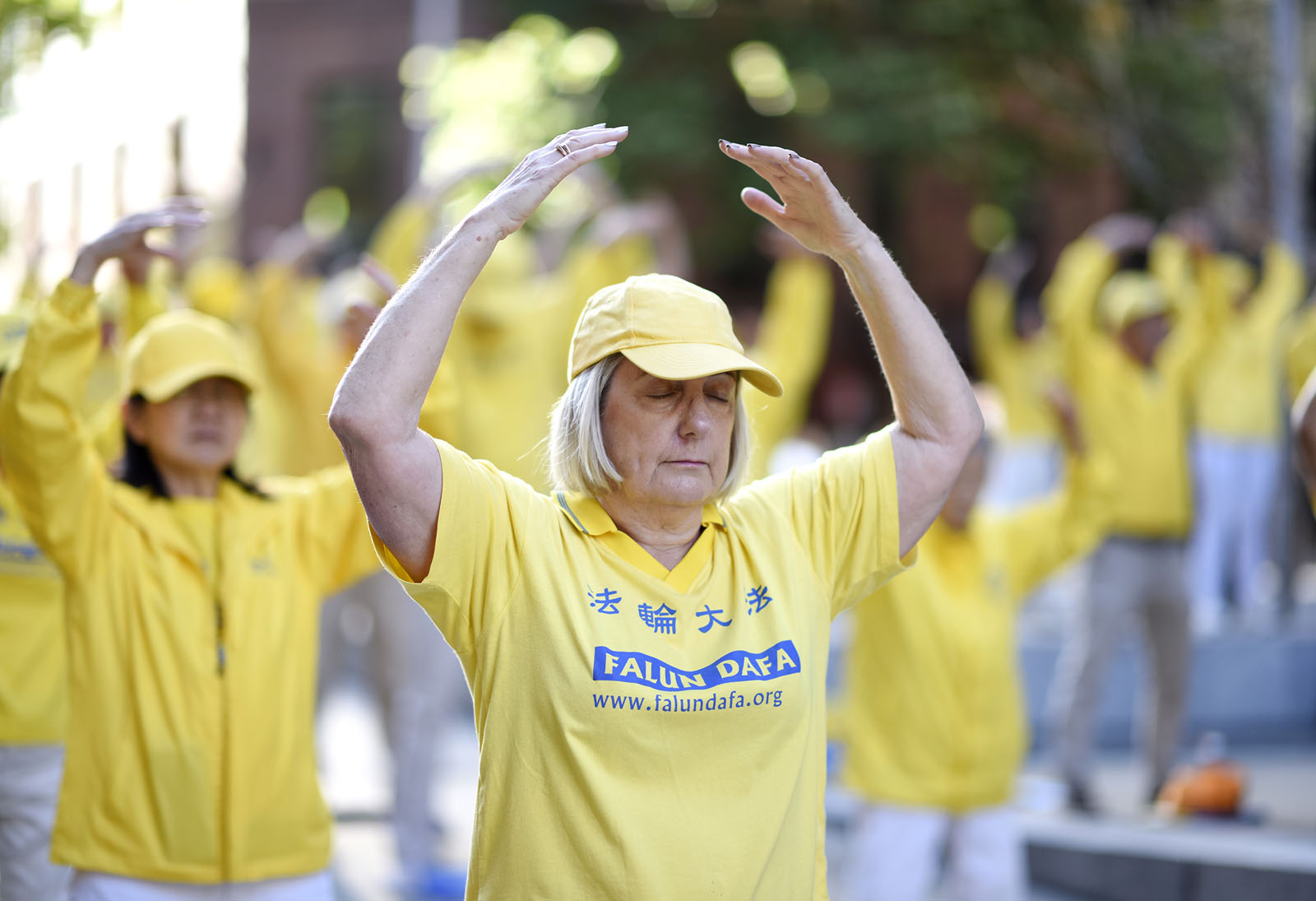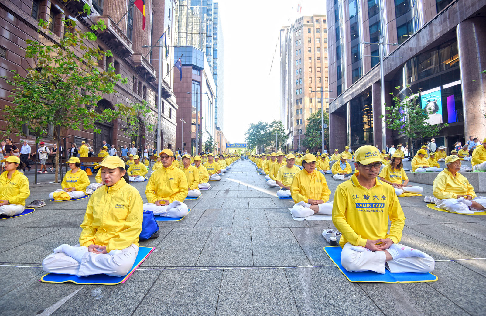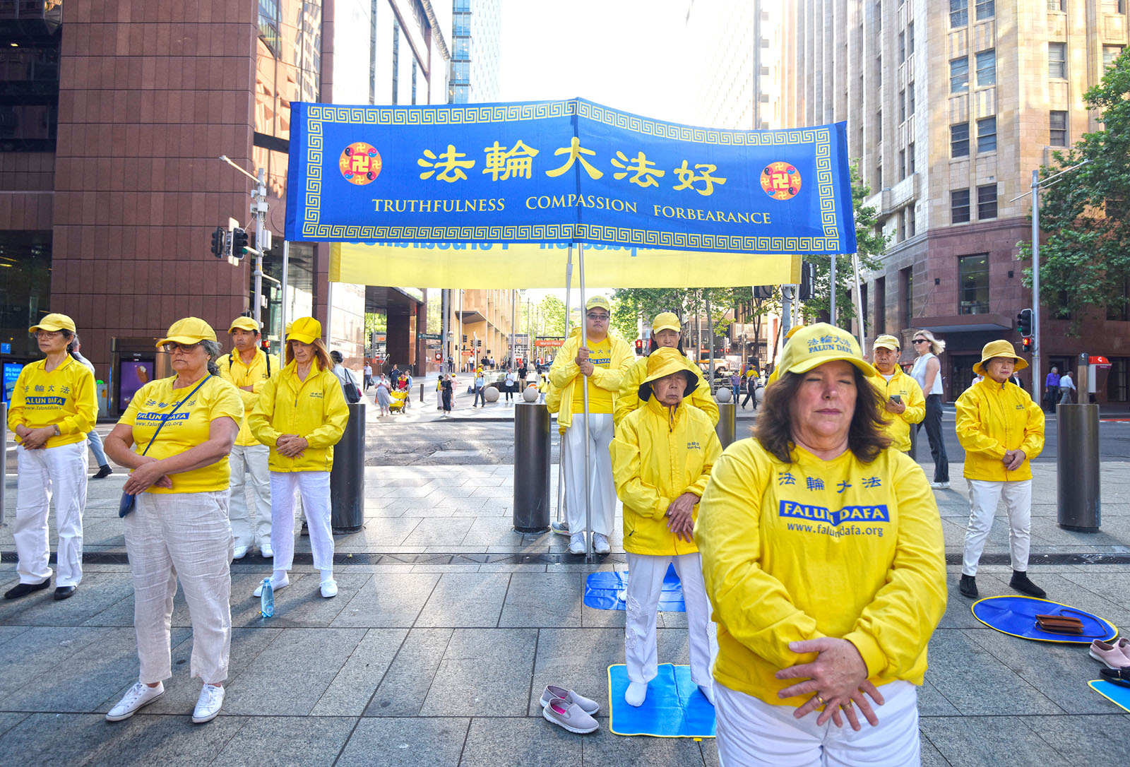 【明慧网二零二五年十月十一日】(明慧澳洲记者站报导)二零二五年十月十日上午,来自全澳各地不同族裔的法轮功学员,在悉尼的“城市心脏”——马丁广场(Martin Place),举行了大型集体炼功活动。