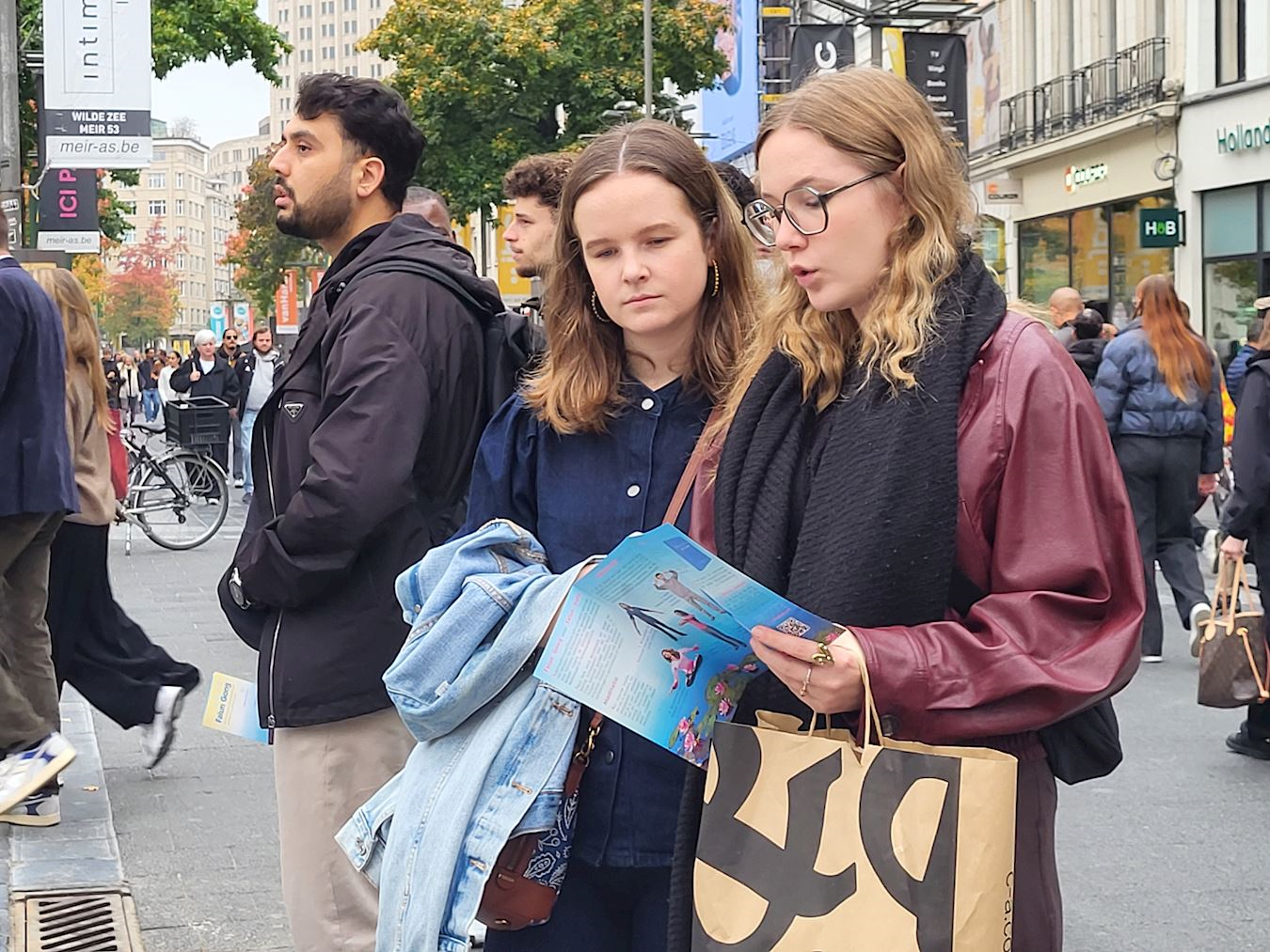 【明慧网二零二五年十月十四日】(明慧记者唐容比利时报道)二零二五年十月十一日金秋季节,著名的安特卫普梅尔(Meir)商业步行街上人头攒动,法轮功学员再一次走上街头,向人们介绍法轮大法(又称法轮功),及在中国遭受的迫害。人们被学员整齐优雅的功法所吸引,驻足观看并赞叹,进而了解法轮功,并纷纷支持反迫害。