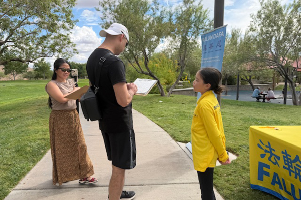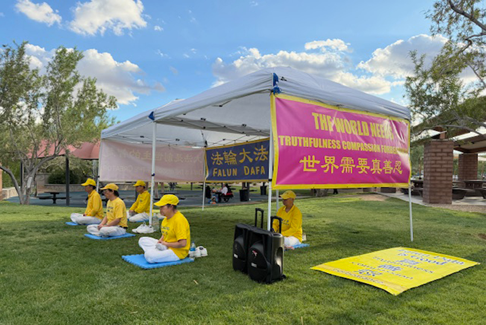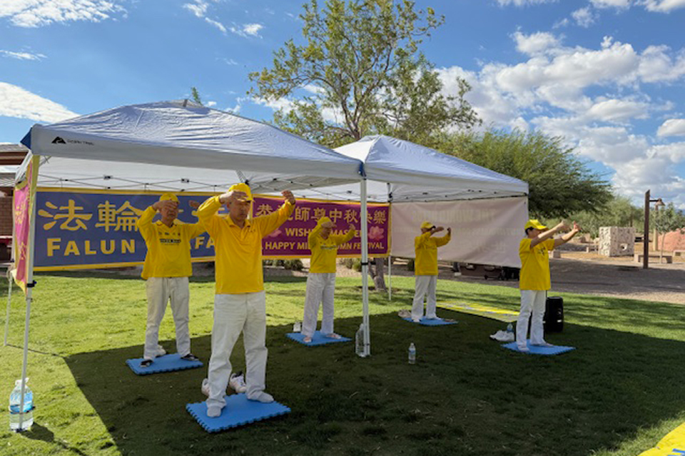 【明慧网二零二五年十月二日】中秋时节“月圆人圆”,寓意着祥和、感念与团圆。一年中秋月又圆,二零二五年九月二十八日下午,拉斯维加斯部分法轮功学员在探索峰公园(Exploration Peak Park)举办庆祝活动,把法轮大法的美好传递给当地民众,同时恭祝师尊中秋快乐,感恩师父的慈悲普度。