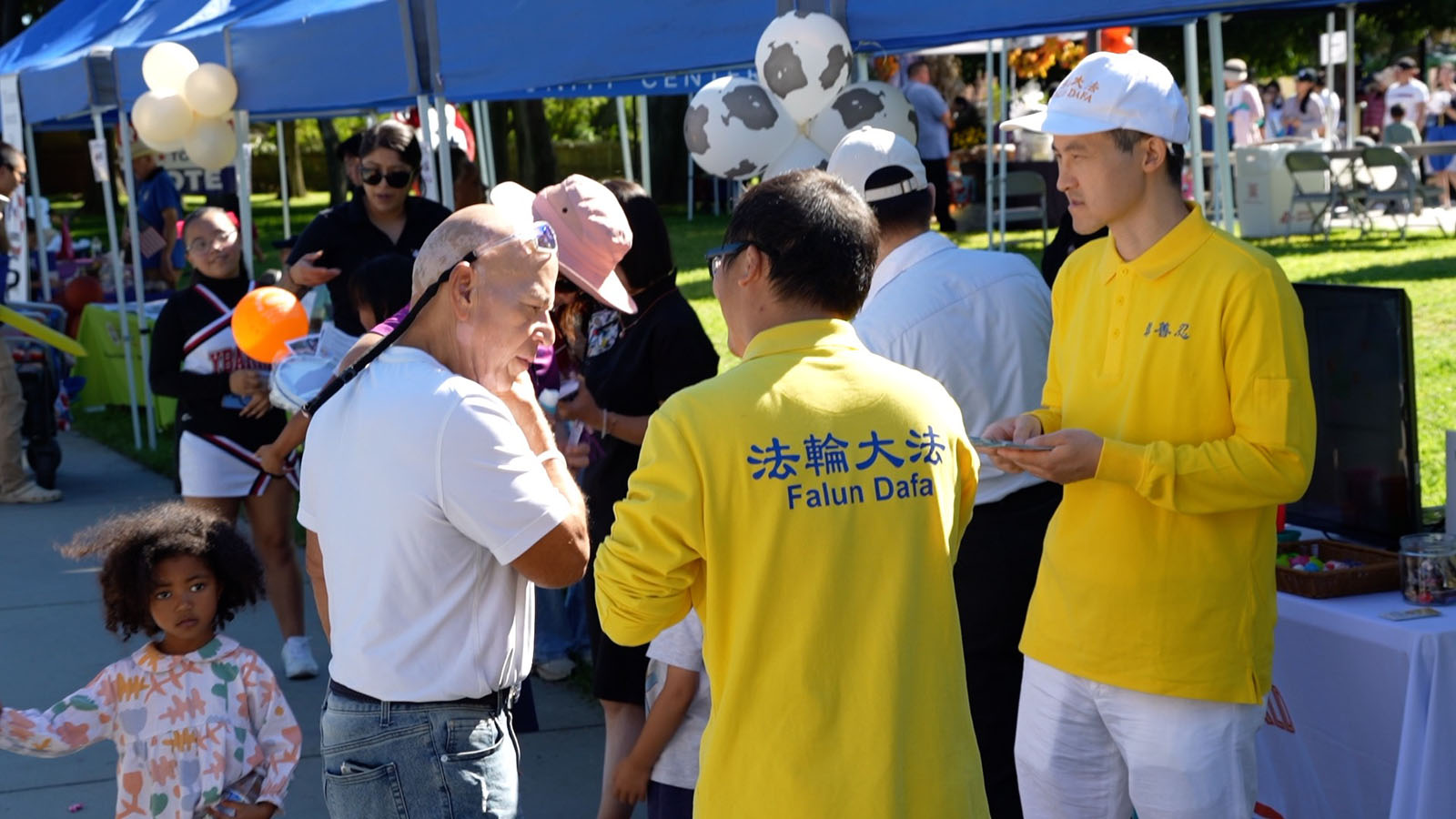 游行结束后,法轮大法学员在罗兰岗公园集体炼功,吸引更多民众驻足观赏与交流,旁边的展位则透过发放资料和小莲花,向民众传递修炼的美好与法轮功学员在中国仍遭中共严重迫害的真相。