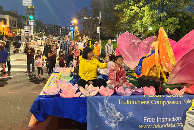 华灯初上,返校日游行于傍晚六點半开始。法轮功俱乐部队伍在优雅的《普度》音乐声中缓缓前行,巨大的粉色莲花花车上,身着汉服的小女孩和唐装的仙女热情的和观众招手,花车前后有俱乐部成员拉着法轮功的横幅,花车两旁还有学员给沿街观众赠送小莲花和书签。俱乐部成员们美丽祥和的姿态受到了沿街观众的赞叹。