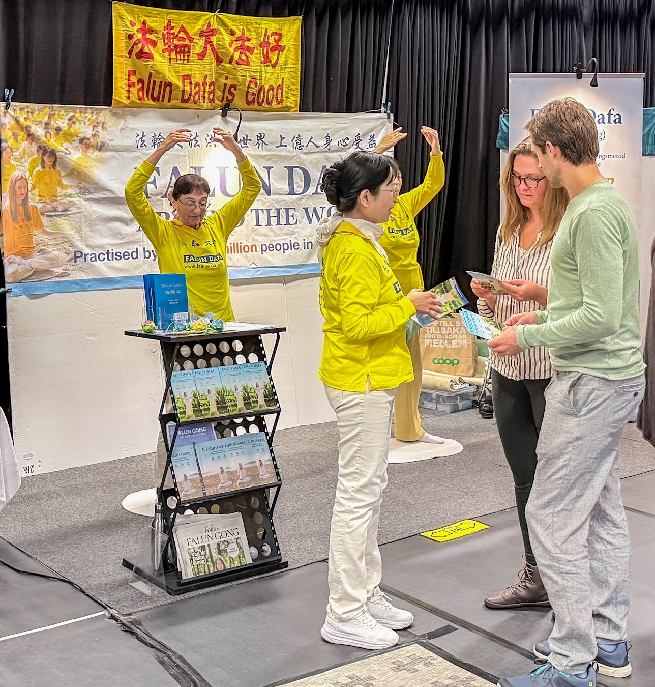 法轮功(又称法轮大法)因其改善身心健康的神奇功效,与展会主题契合。每年,法轮功学员都被主办方邀请参展,几乎每次都被安排在展览大厅离表演舞台近、人流量多的位置。宁静祥和的炼功场面让匆匆过往、在忙碌喧嚣中的人们体验到了平静与安宁,缓解了他们的焦虑和烦恼,许多人都在询问各地哪里有炼功点,不少人还当场体验炼功动作。当人们得知十一月二十日有瑞典语网上免费教功班时,纷纷踊跃报名参加。(瑞典语学功网址:www.falungong.se)