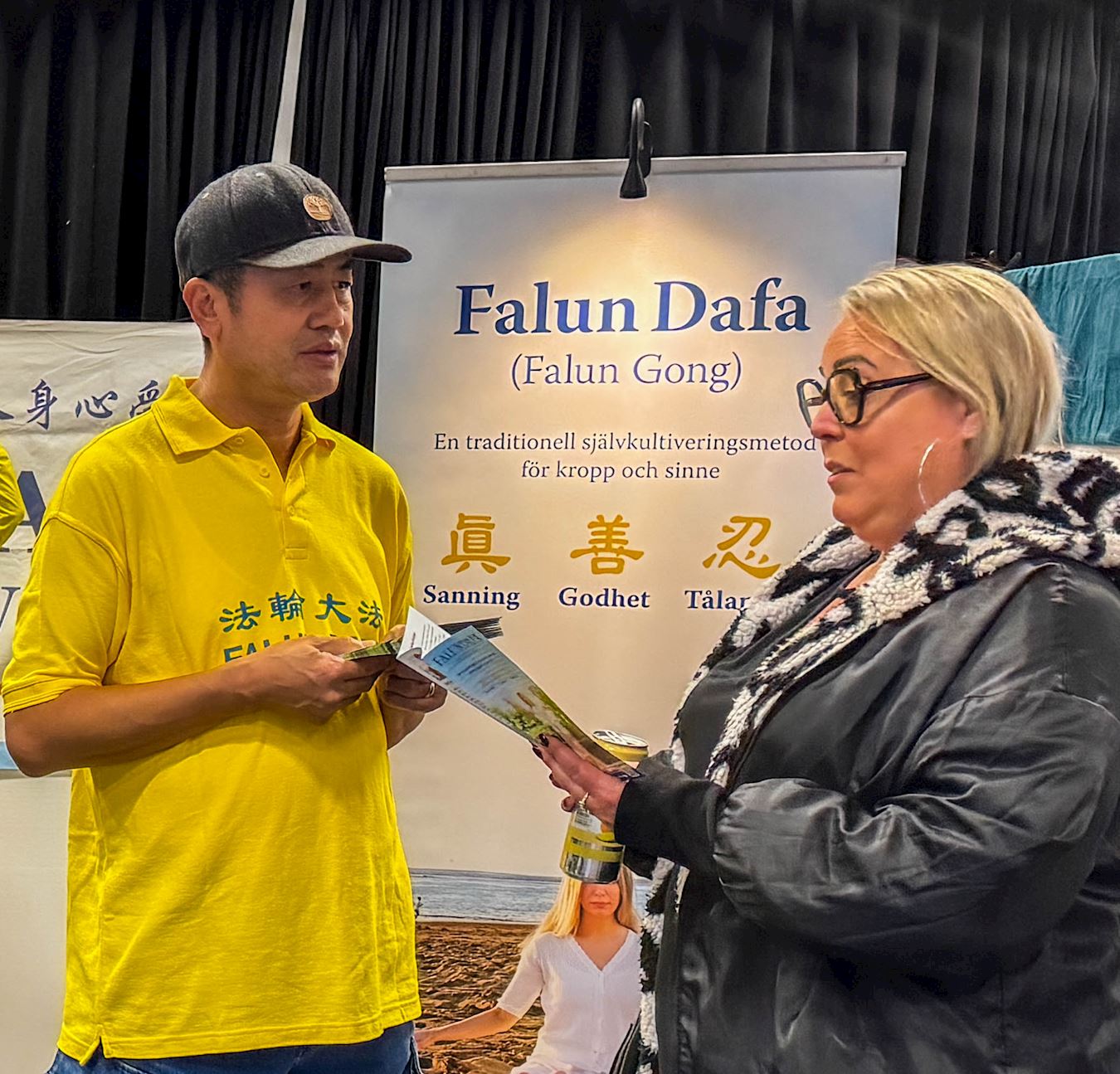 两天展会期间,很多参观者在与学员的交谈中了解到法轮大法是由李洪志先生于一九九二年五月在中国传出的佛家上乘修炼大法,指导修炼者以真、善、忍为原则提升道德与身体健康,至今已弘传一百多个国家,法轮功的主要著作《转法轮》已被译成五十种语言,获褒奖、支持决议案和信函逾万项。听了学员的介绍,人们对法轮功真、善、忍的普世价值表示认同,来展台购买法轮功书籍的有缘人络绎不绝。来自瑞典北部一位年轻女士就是其中的一个。