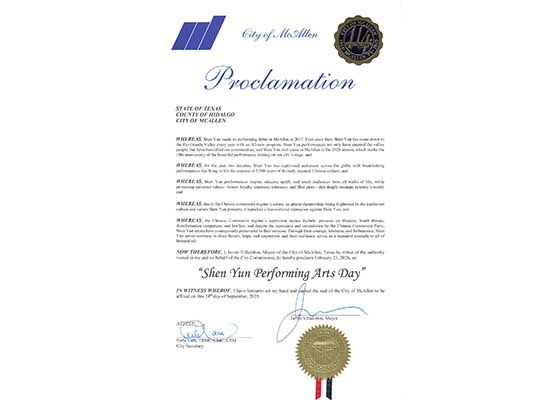 九月二十四日,美国德克萨斯州麦卡伦市市长哈维尔·维拉洛沃斯正式签署公告,宣布二零二六年二月二十一日为“神韵艺术团日”。
