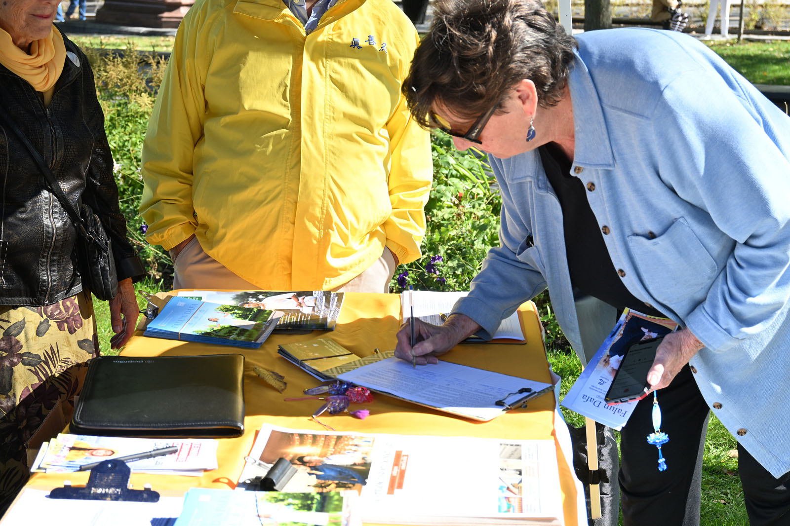 图12~14:很多民众当了解真相后,纷纷在呼吁魁北克政府不要参与中共跨国镇压法轮功的请愿书上签名声援法轮功学员。