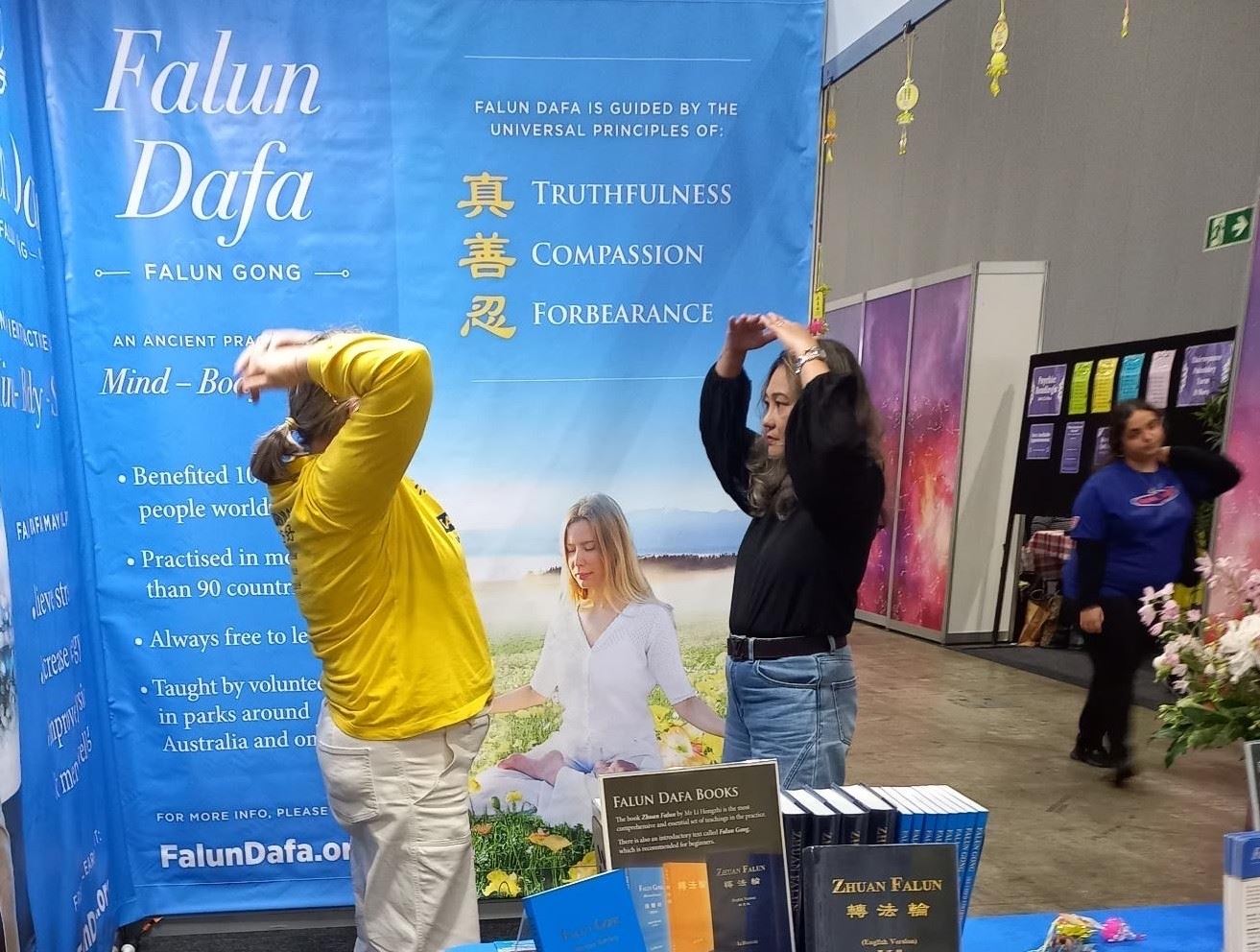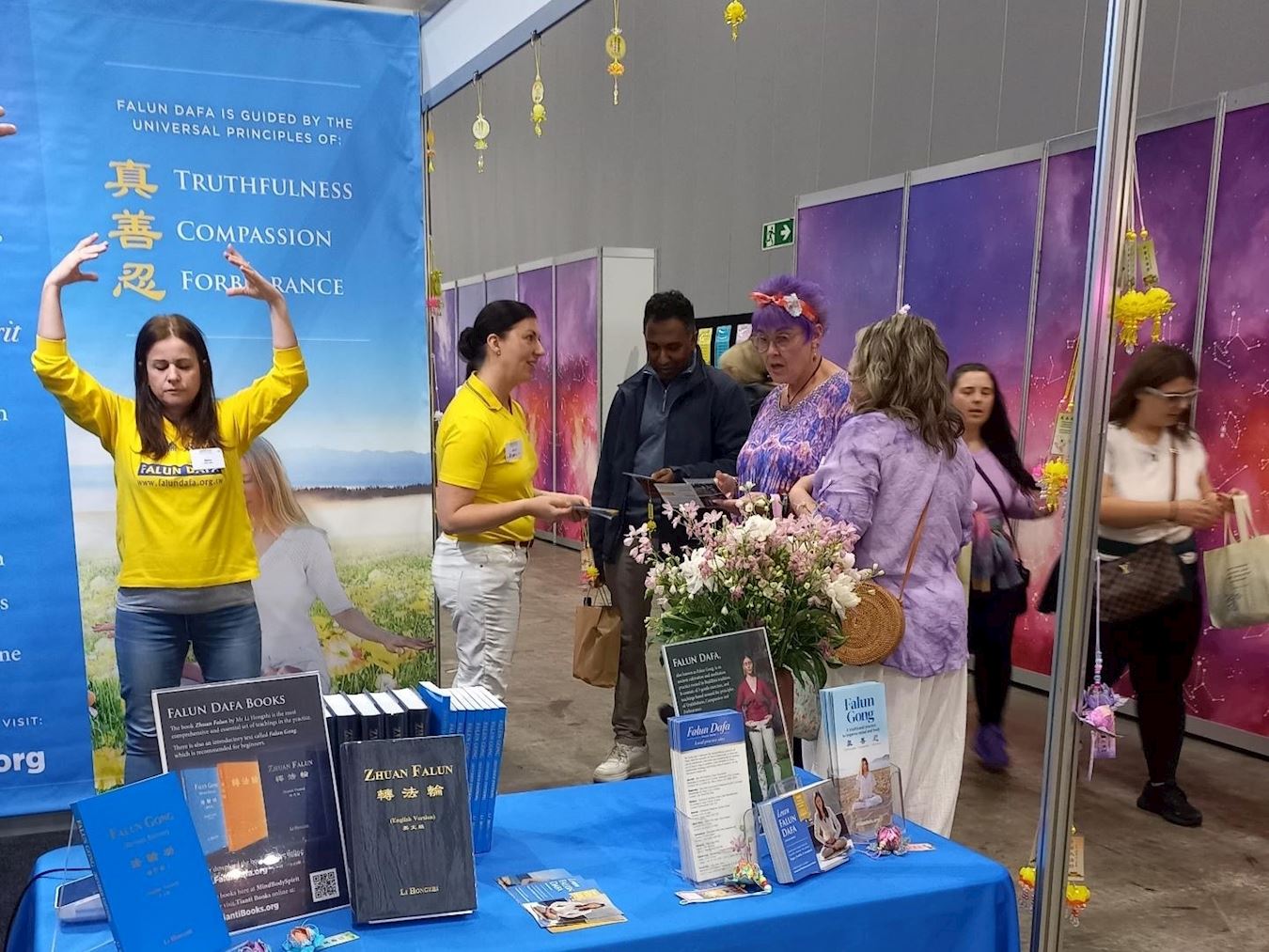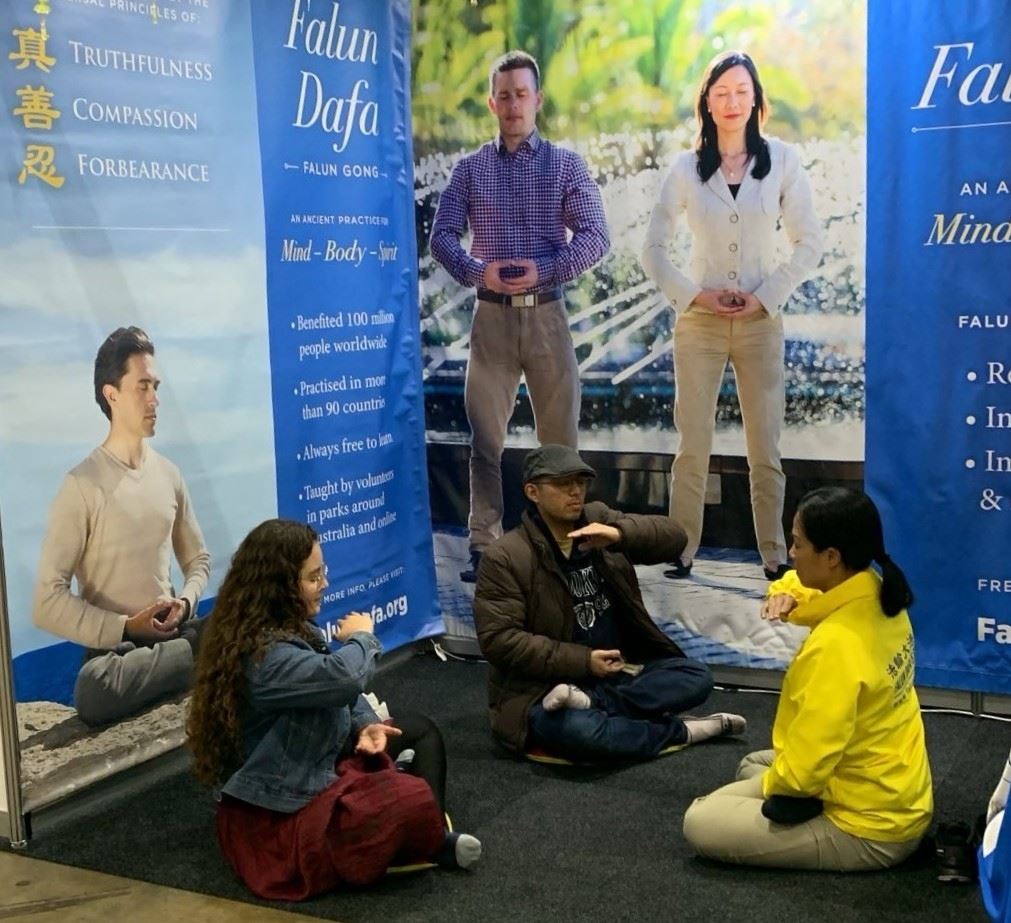 本次展会上有超过一百四十个参展摊位,提供健康和自然产品以及精神指导等。法轮大法展位亮丽的色彩、舒缓的功法展示以及祥和的能量场,每天都吸引很多观众驻足了解详情。