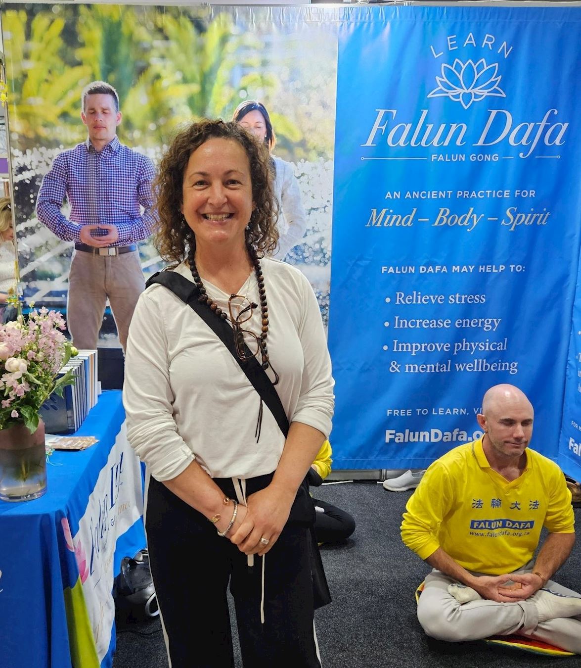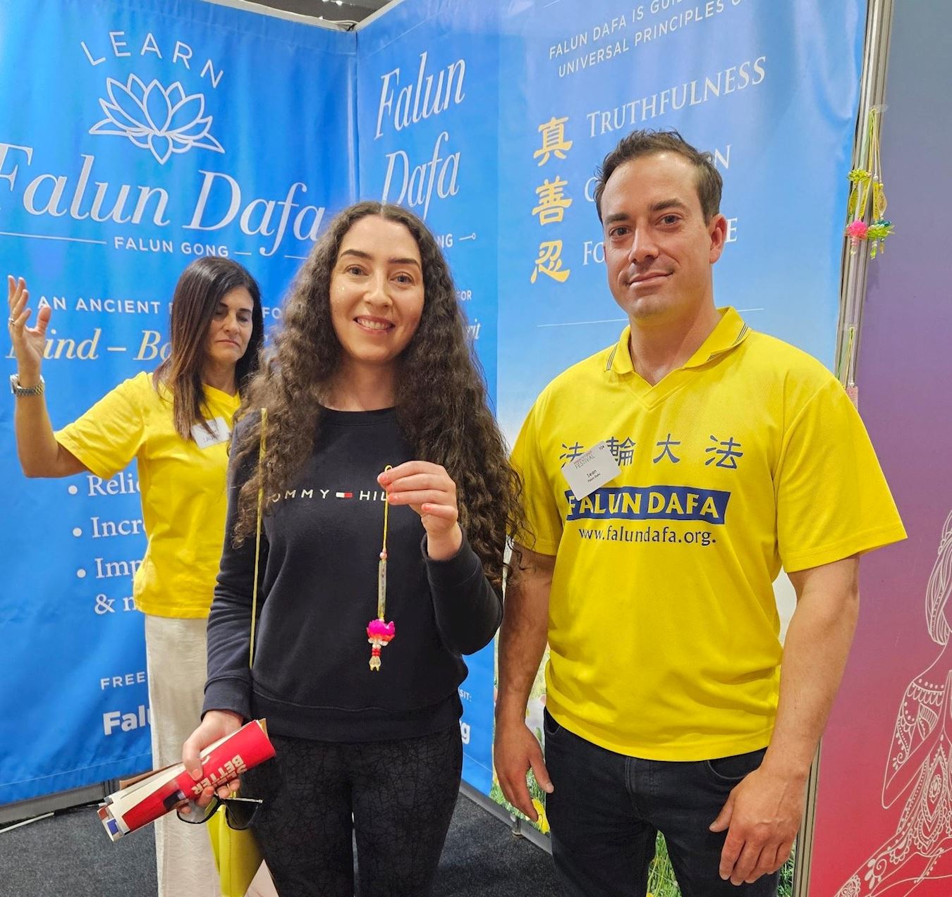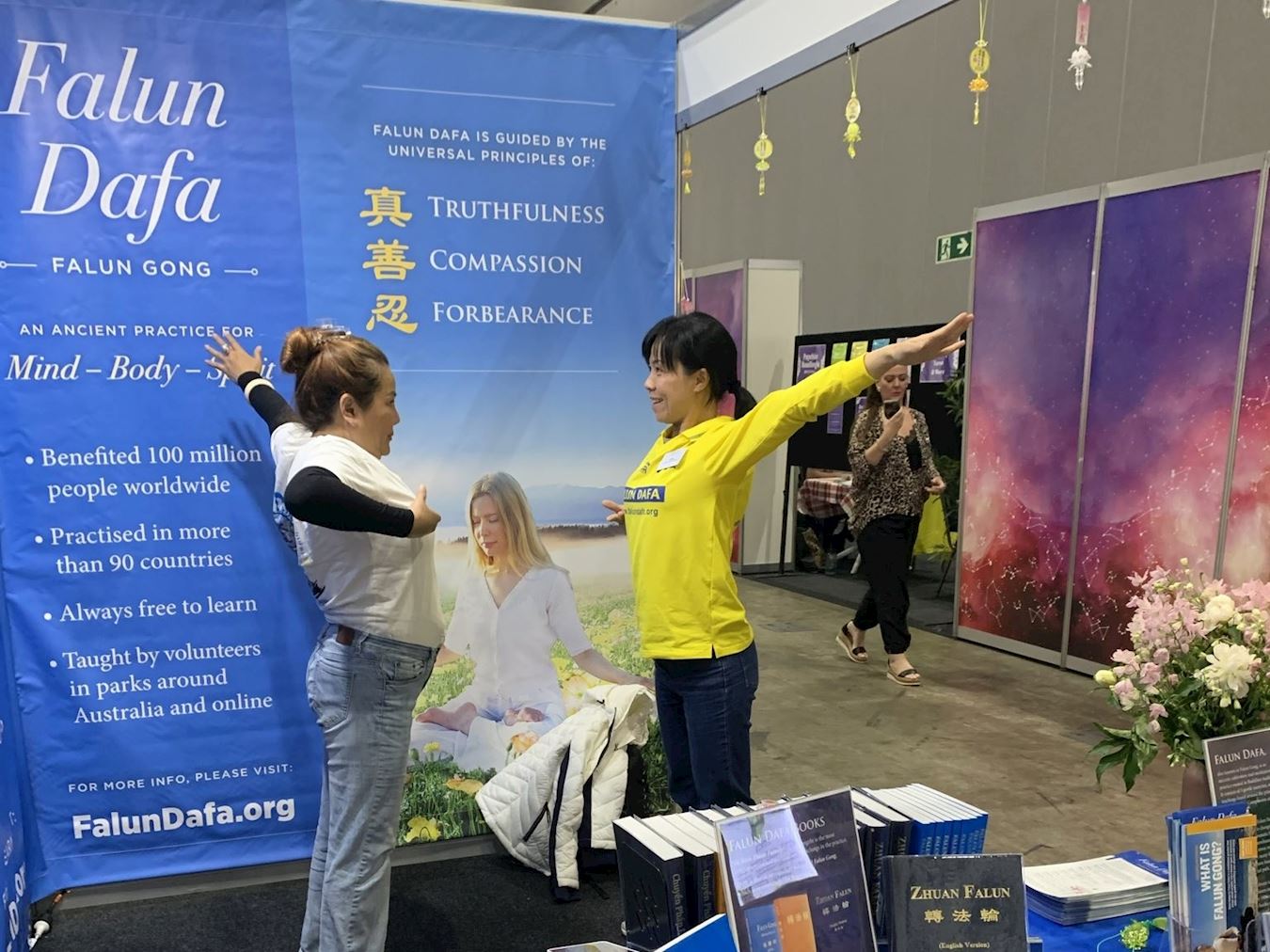 本次展会上有超过一百四十个参展摊位,提供健康和自然产品以及精神指导等。法轮大法展位亮丽的色彩、舒缓的功法展示以及祥和的能量场,每天都吸引很多观众驻足了解详情。