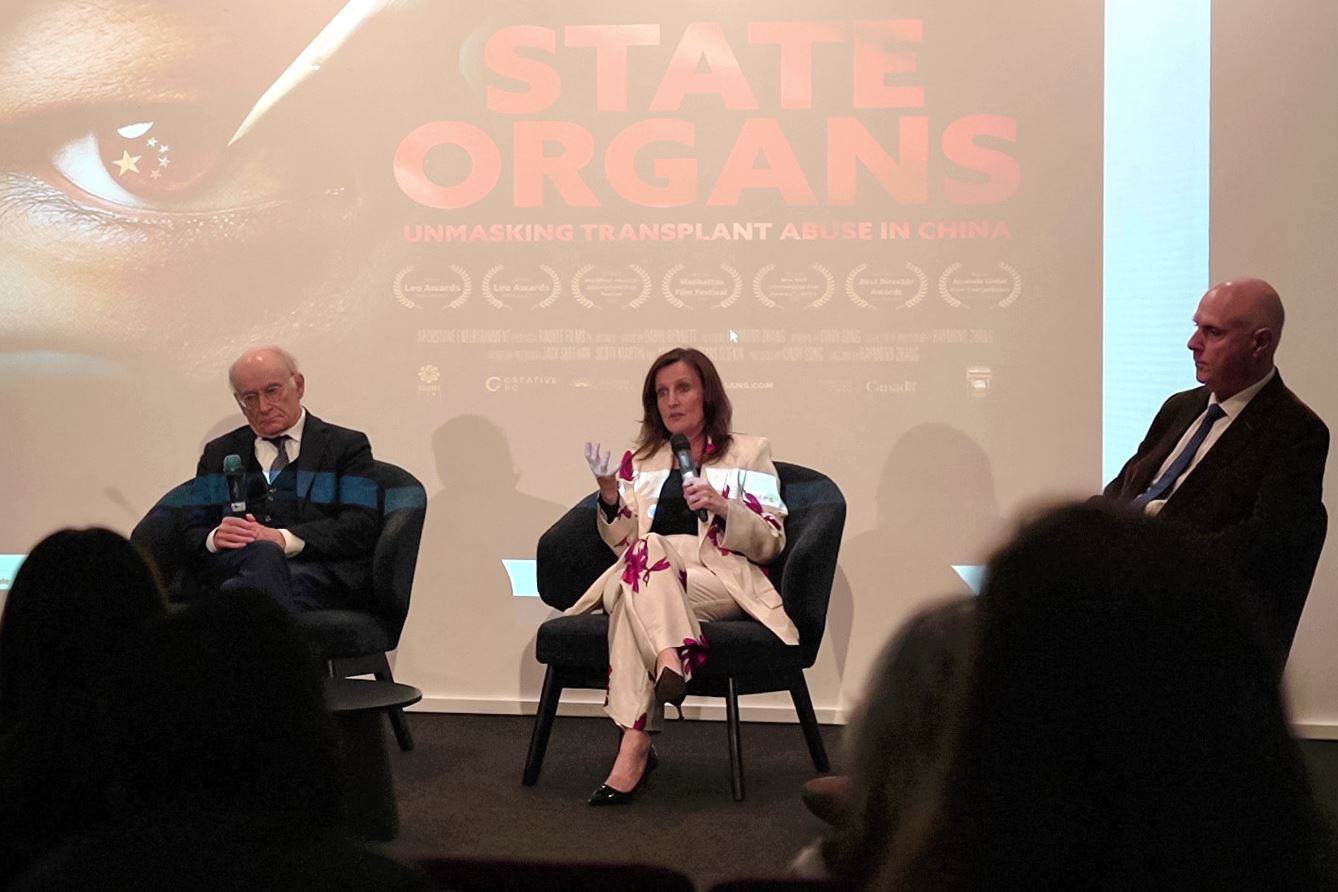 图15:二零二五年十一月初,澳洲国际人权律师马德琳‧布里吉特(Madeleine Bridgett,中)与加拿大国际人权律师麦塔斯(David Matas)和戴乐出席电影《国有器官》座谈会。