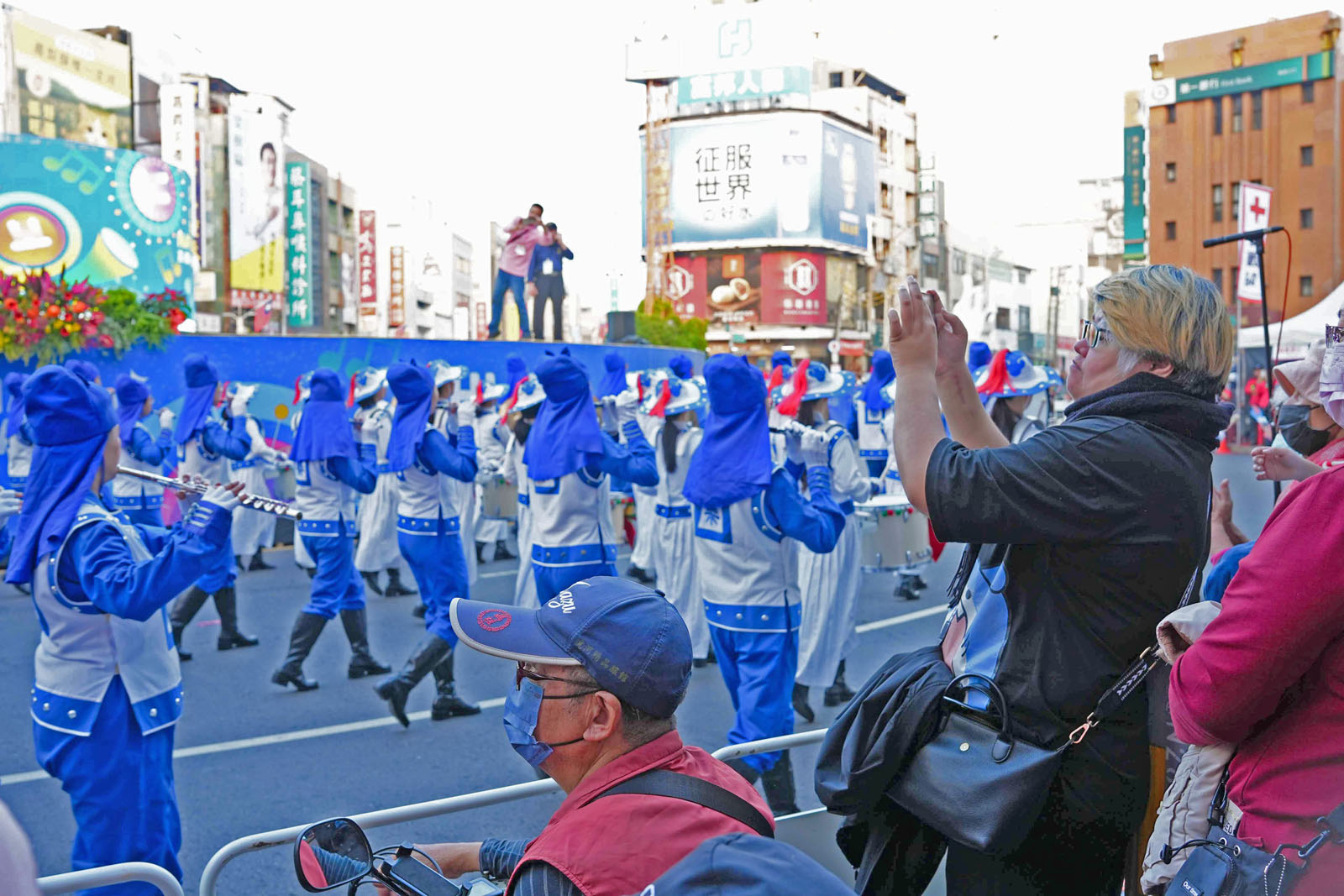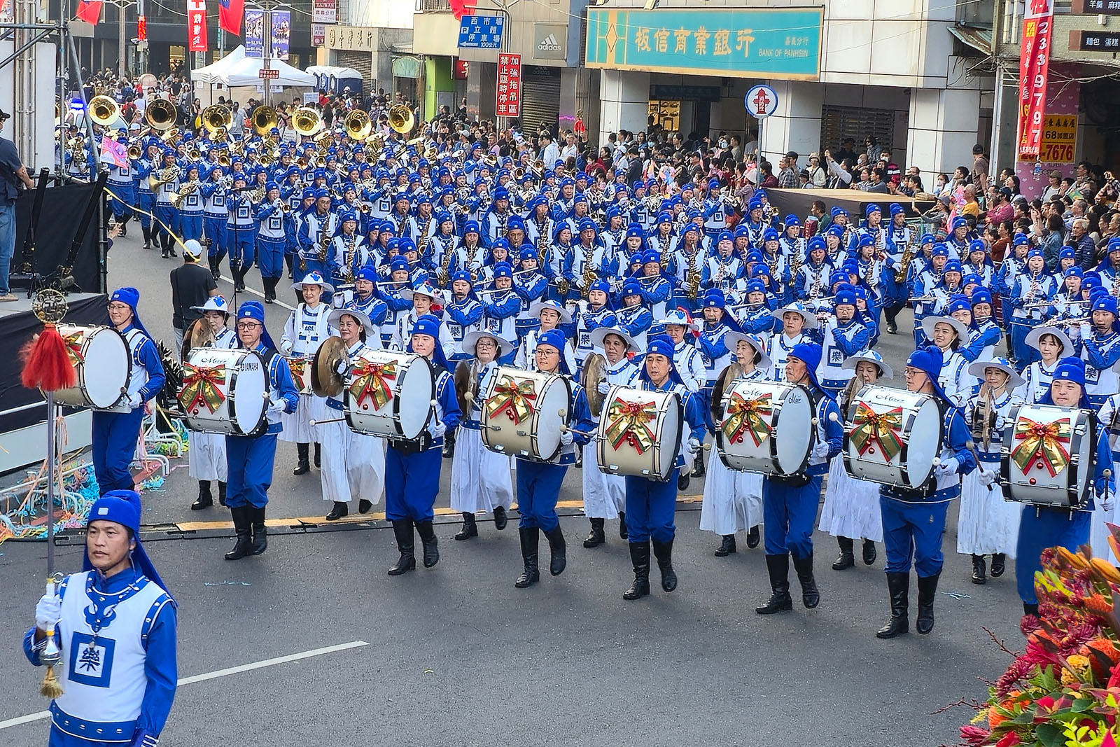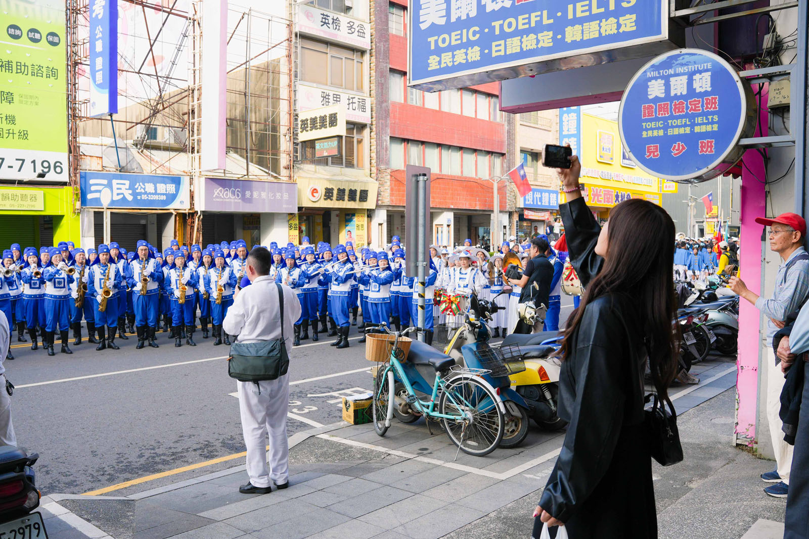 法轮大法天国乐团气势磅礴,乐音嘹亮震撼人心,游行期间家家户户的人都从巷弄里出来庆祝、欢迎。观众们纷纷拿起相机纪录,热情的向团员挥手、比出“赞”的手势。