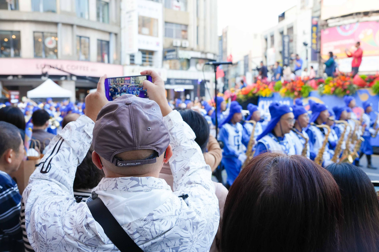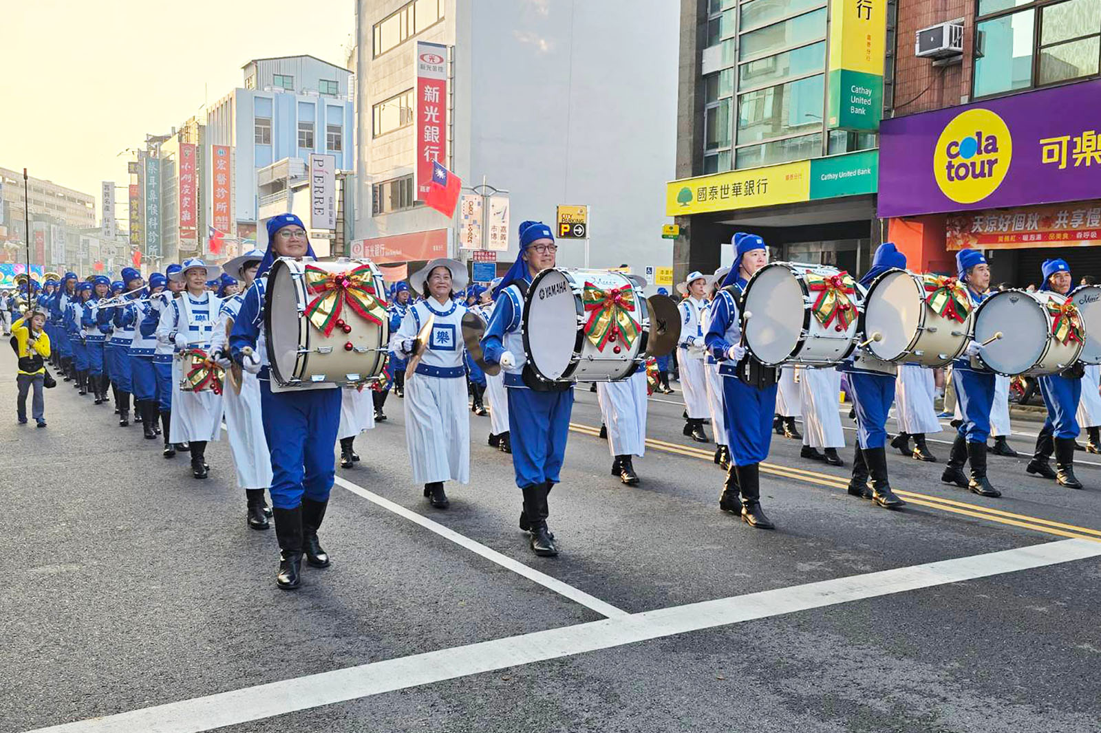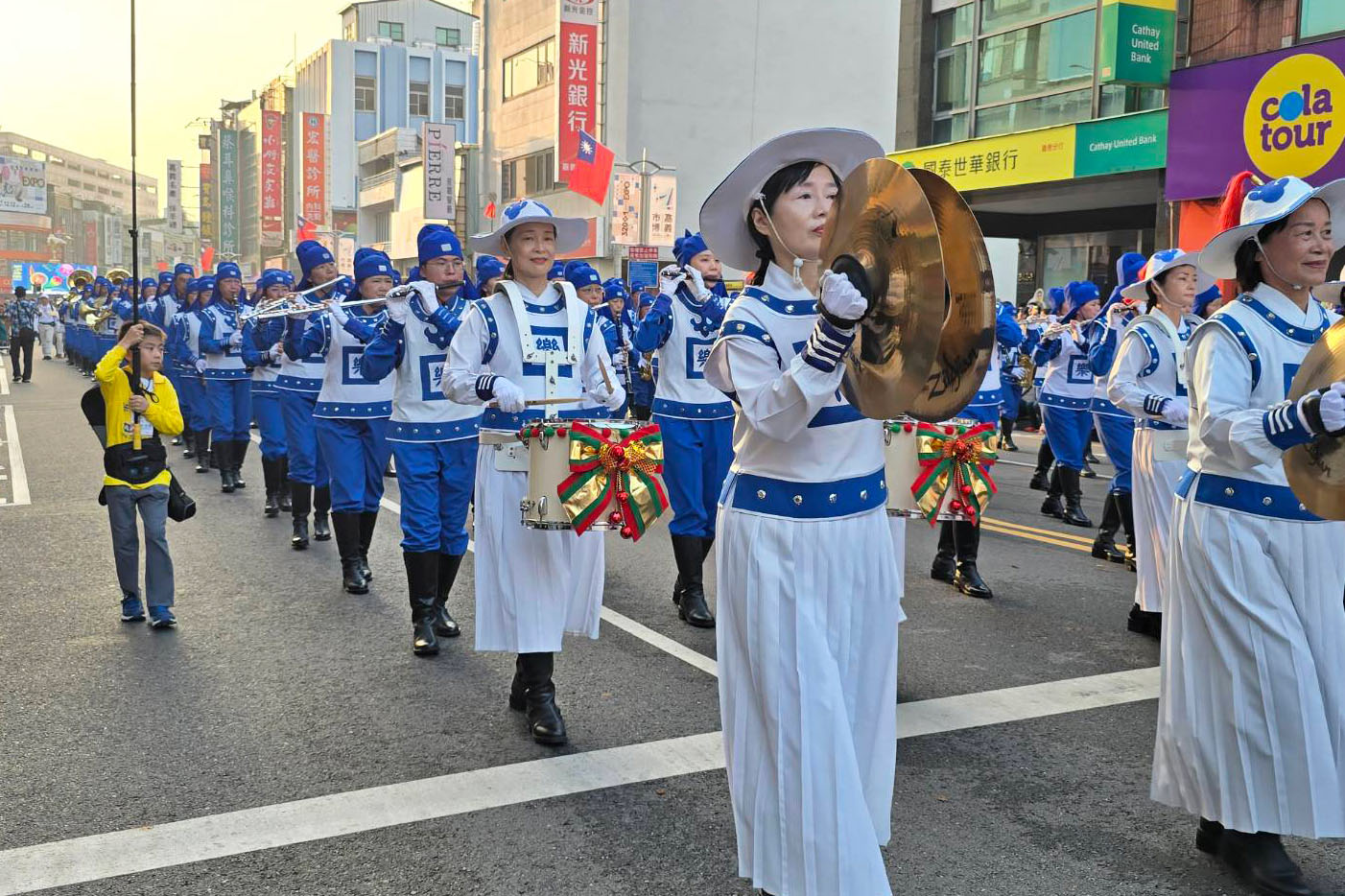 法轮大法天国乐团气势磅礴,乐音嘹亮震撼人心,游行期间家家户户的人都从巷弄里出来庆祝、欢迎。观众们纷纷拿起相机纪录,热情的向团员挥手、比出“赞”的手势。