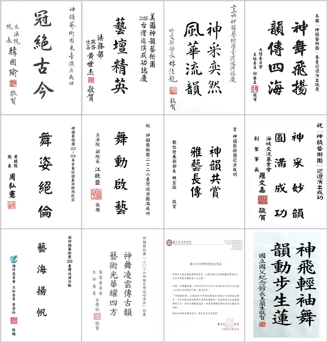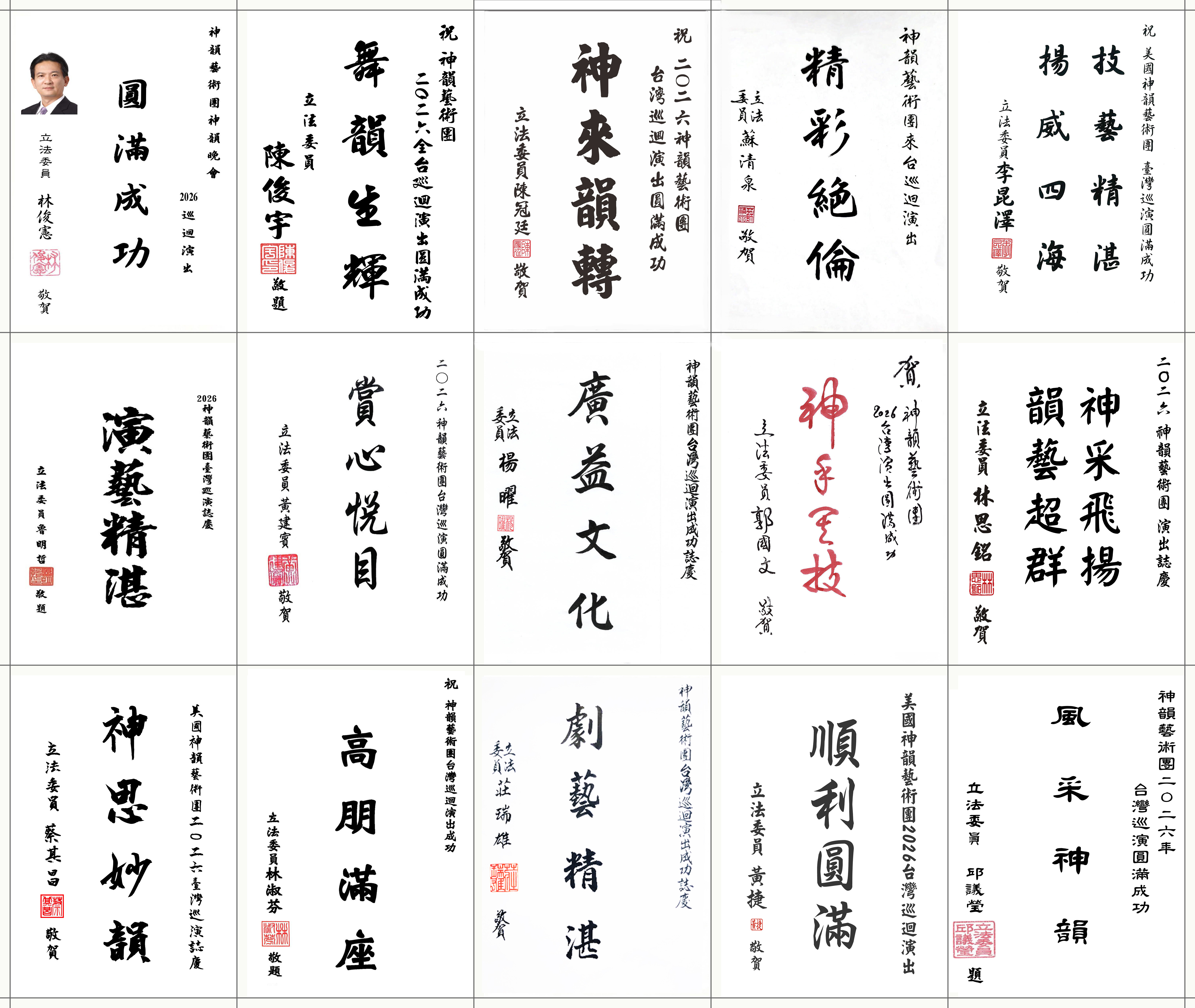 中央部会首长致贺,有立法院长、考试院长、数字发展部等十三位中央政府官员致赠贺词。其中包括立法院长韩国瑜以“冠绝古今”盛赞神韵的艺术成就;考试院院长周弘宪赞誉神韵“舞姿绝伦”;外交部长林佳龙则以神韵“神采奕然 风华流韵”形容神韵的风貌;法务部政务次长黄世杰则以“艺坛精英”致意。