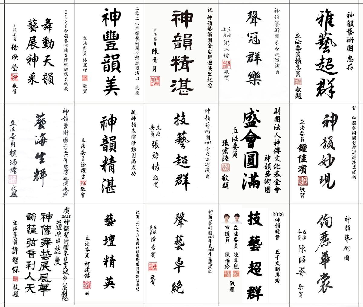 神韵“世界第一秀”的顶级口碑在台湾主流精英圈广为流传,每年均吸引大批政要名人入场观赏,诸多国会议员也纷纷致赠贺词,赞赏和迎接神韵的到来,今年计有七十位。包括立法委员王定宇赞神韵“舞艺倾城”;立法委员沈伯洋祝神韵“圆满成功”;立法委员吴思瑶赞神韵“声艺卓绝”;立法委员何欣纯赞神韵“艺臻化境”;立法委员邱志伟题赠“姿雅荠妙”;立法委员许智杰以“神传舞艺展风华,韵蕴弦音利人天”欢迎神韵;立法委员赖瑞隆赞神韵“艺海生辉”;立法委员钟佳滨赞叹神韵“神韵妙现”;立法委员苏巧慧称赞神韵“传道宏艺”。(节选)