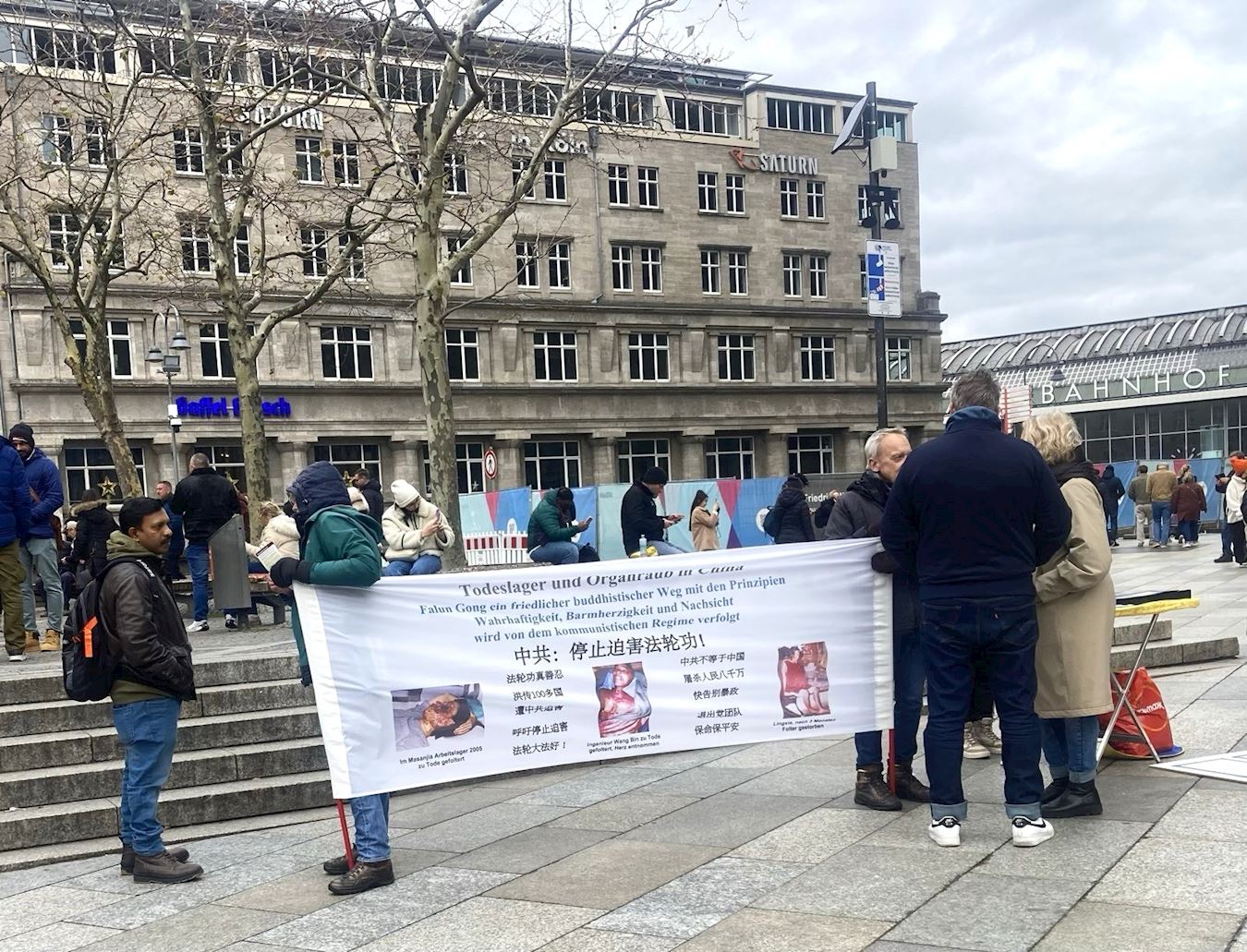 十一月三十日中午时分,科隆大教堂广场上挤满了各种族裔、肤色的游客。为了便于游客了解真相,法轮功学员准备了二十几种不同文字的传单。很多人在等候同行者从教堂出来的空档,注视、阅读法轮功学员展示的横幅,或主动上前和学员交谈,取得相关资料。很多人惊讶于中共迫害法轮功的严重性,有的表示尽管已听说过中共活摘器官的罪行,但横幅上的字句与图片仍旧令其震惊。
