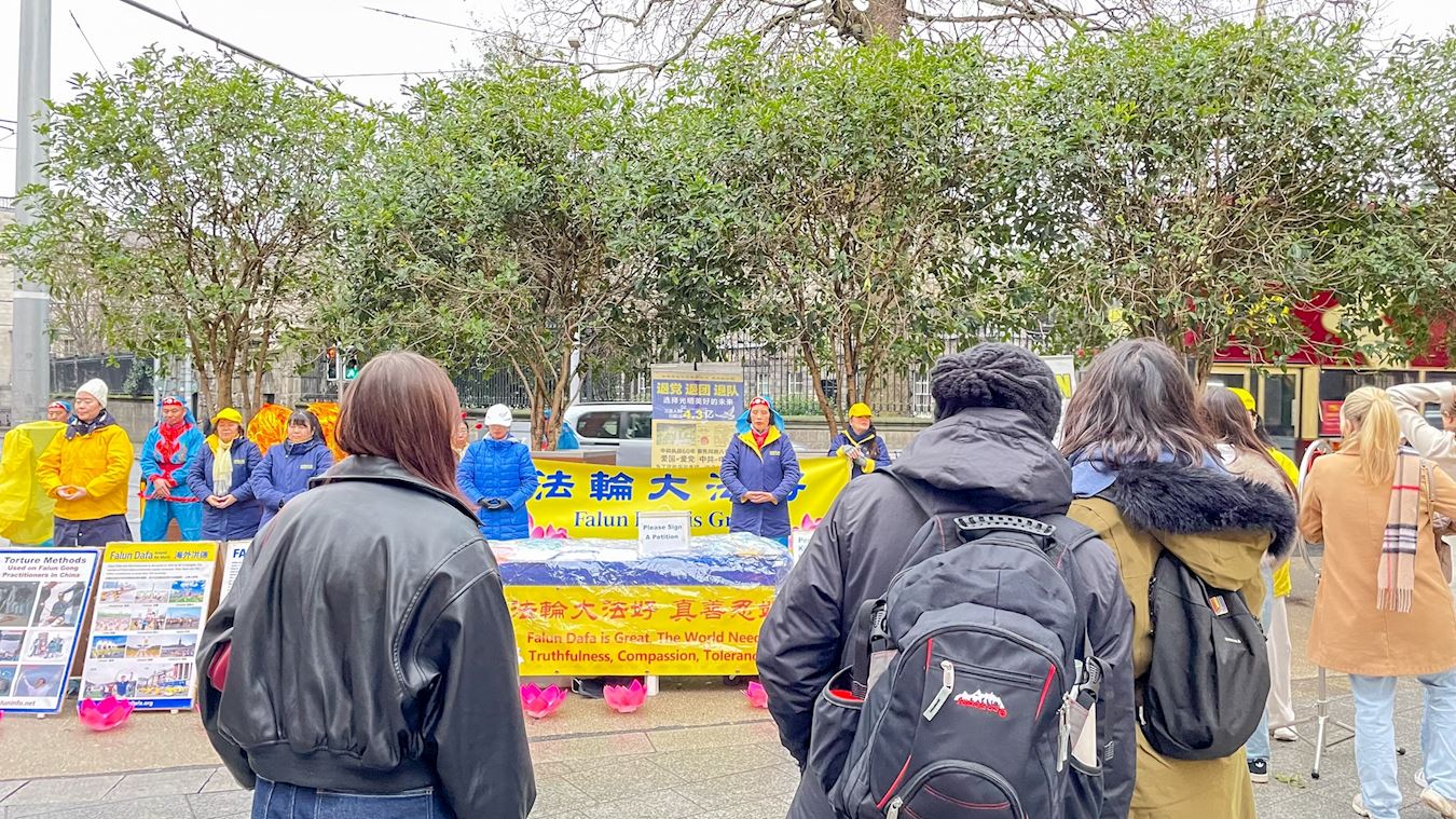 '图1~3:二零二五年二月八日,部份法轮功学员在爱尔兰首府都柏林庆祝即将到来的元宵节,民众驻足观看'