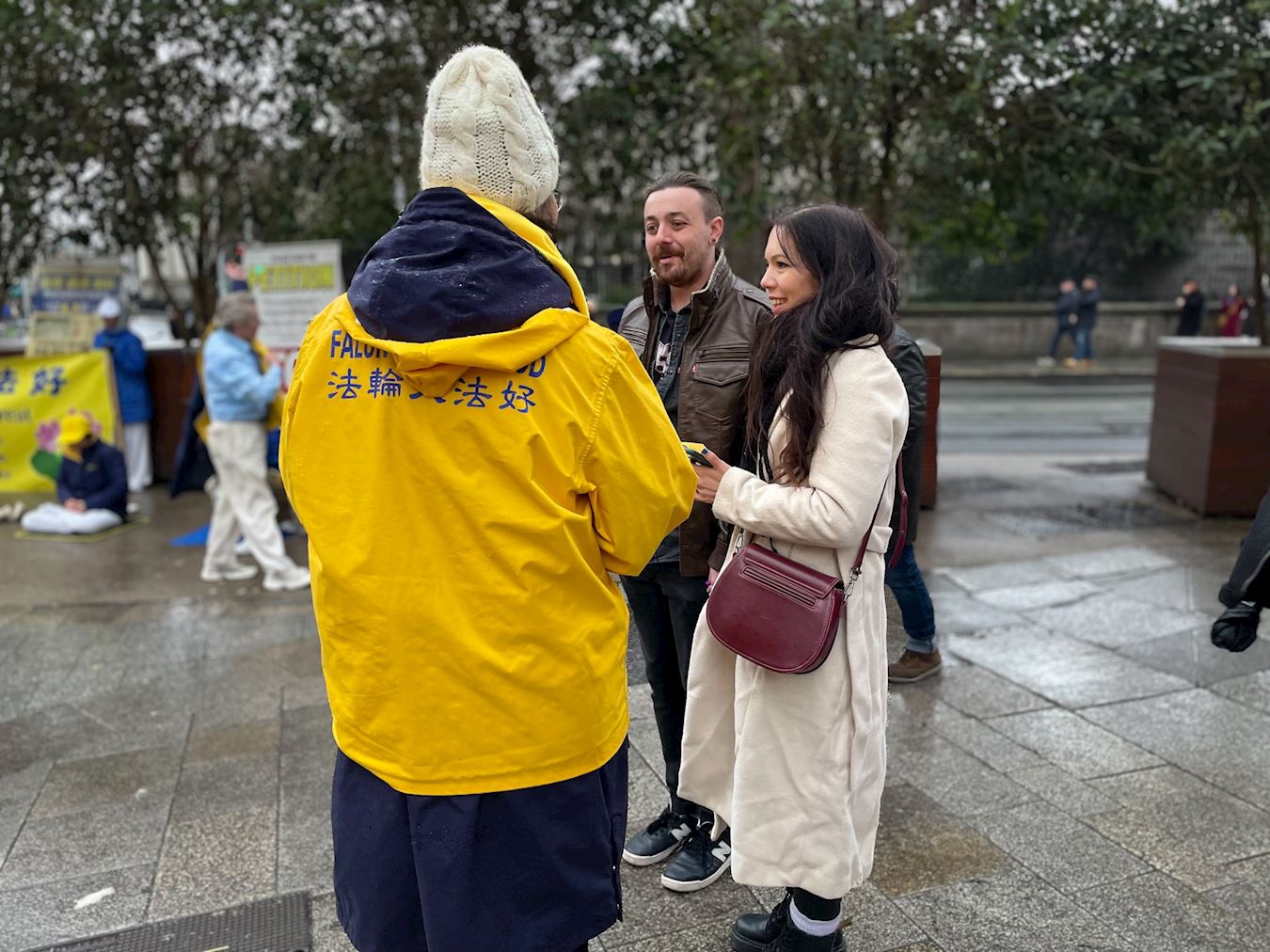 活动开始前,天空飘着细雨,看到展板上醒目的制止中共活摘法轮功学员器官,许多人接过传单,或停下阅读展板。来自葡萄牙的玛丽安娜(Mariana)与学员交谈后,签名支持反迫害,“我想为被沉默的人发声,这是我一直以来的愿望。”玛丽安娜说,“现在出现了许多不幸的事情,每个人都在受到影响。而我们如此幸运、能有机会为他人发声时,要站出来(表达支持),这至关重要。”
