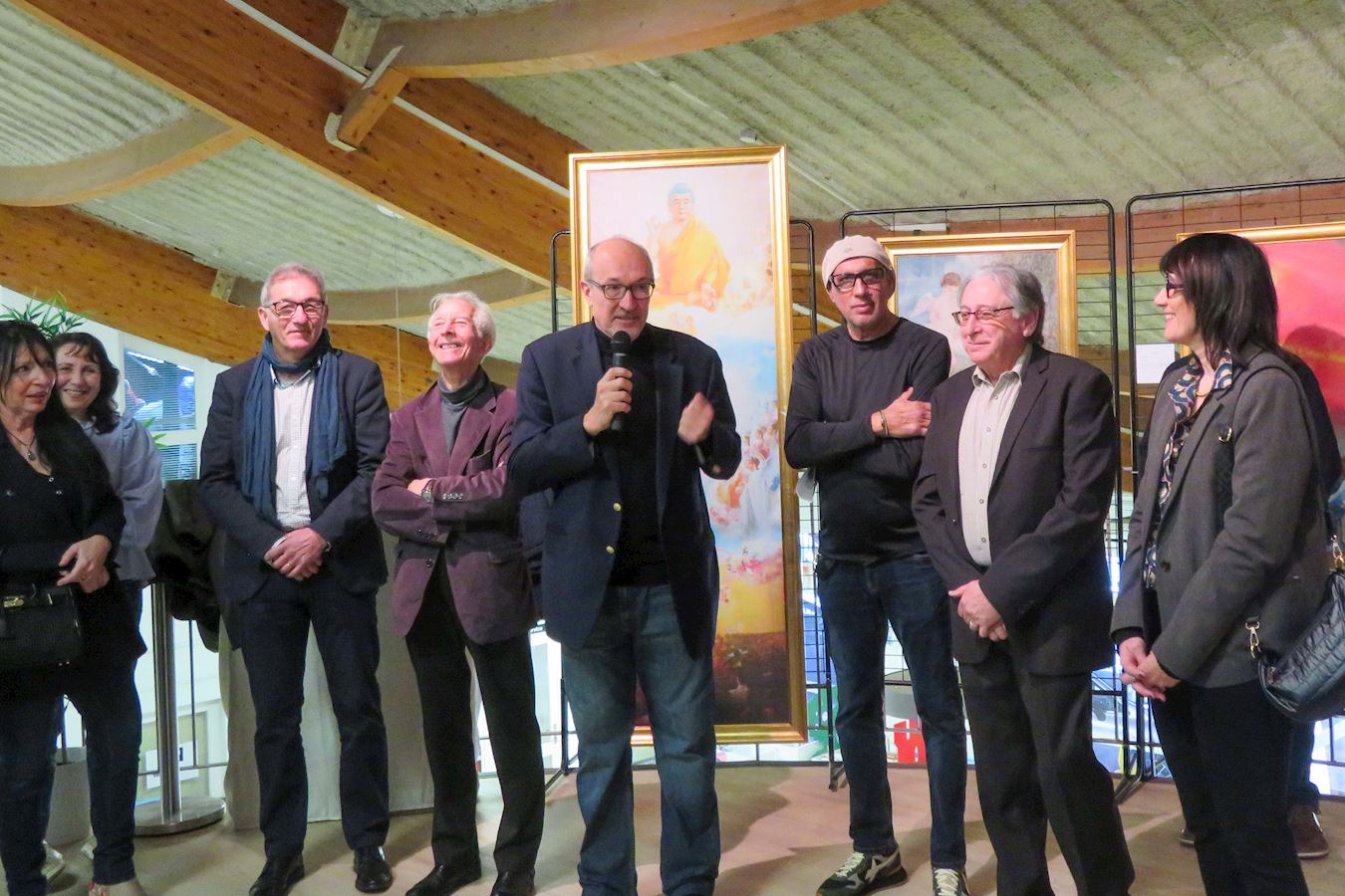 '图1~2:二零二五年二月八日,国际真善忍美术展在法国马利尼纳市媒介图书馆拉开了序幕。多位市政府官员和部份当地民众参加了开幕式典礼。'