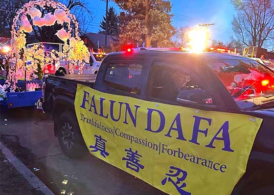 美国法轮功学员参加雪镇灯光大游行