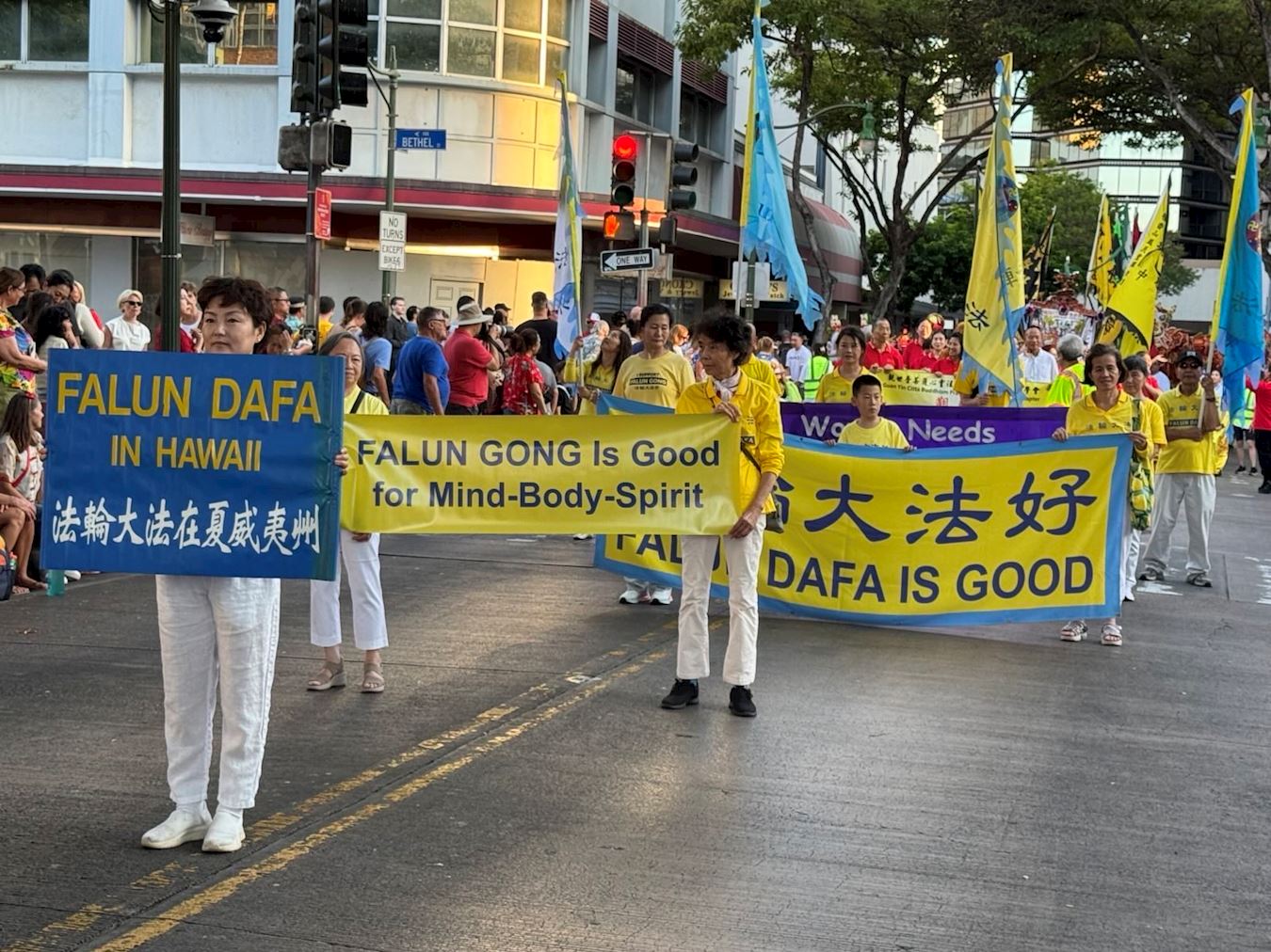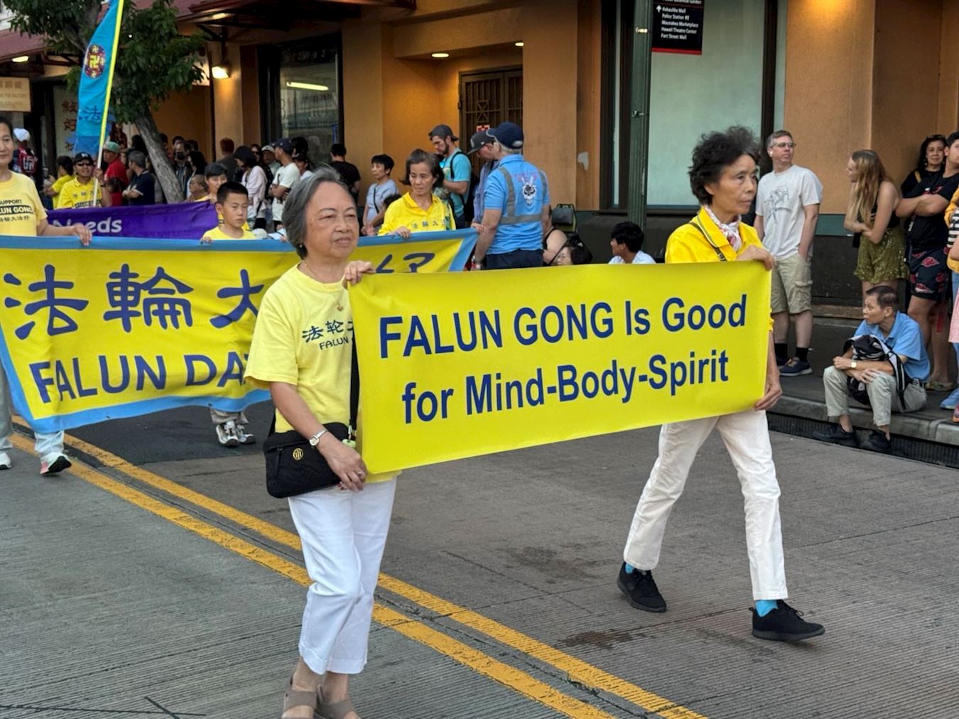 在游行中,法轮功学员打出“法轮大法在夏威夷州”、“法轮大法好”、“世界需要真善忍”等条幅,赢得了人们的喜爱。有的人向法轮功学员双手合十,表示祝福;有的人看到”世界需要真善忍”而竖起大拇指;也有华人同胞高喊一声“法轮大法好!”