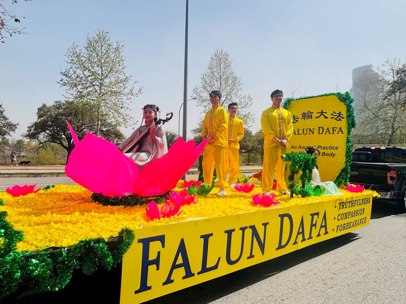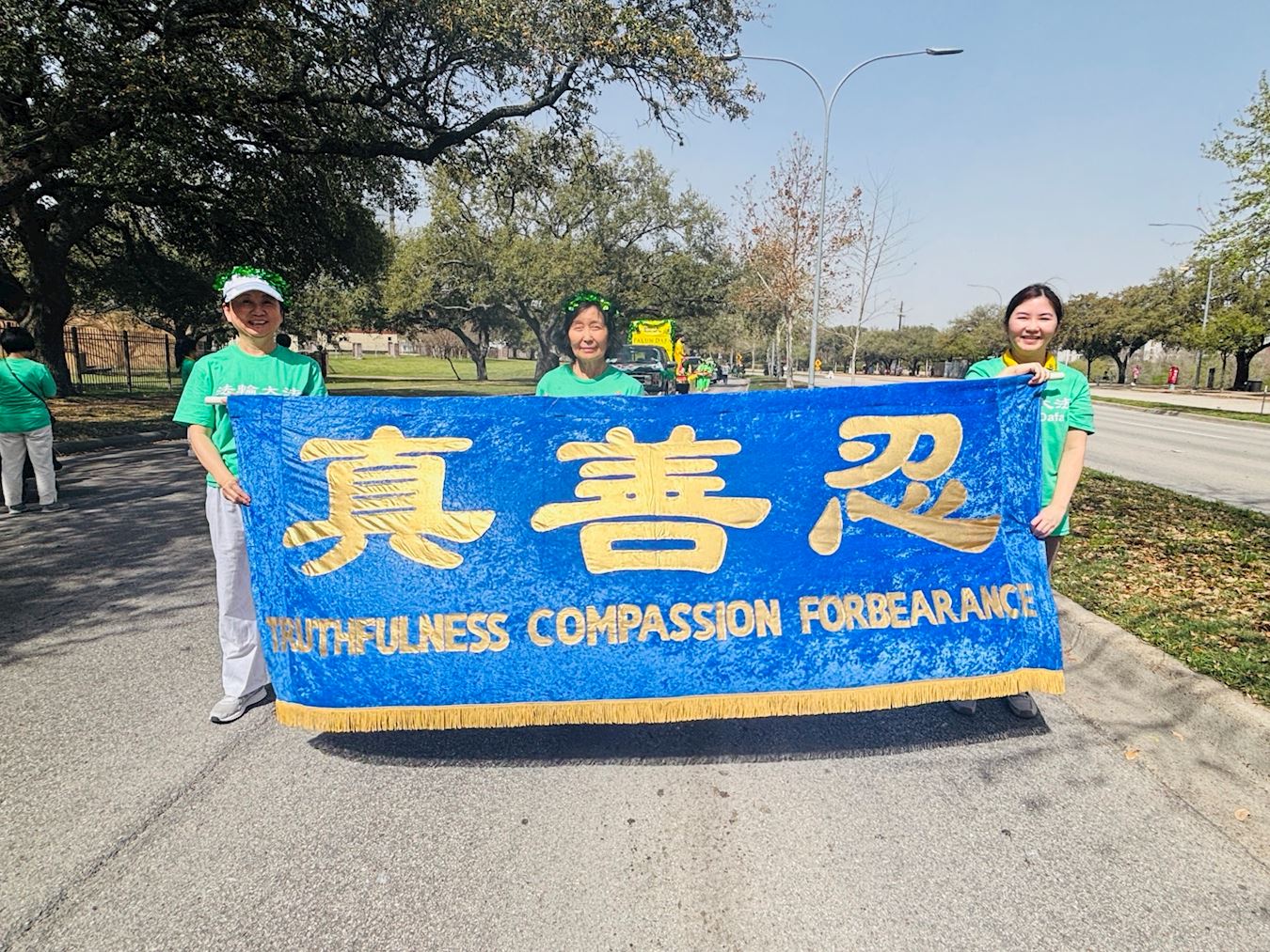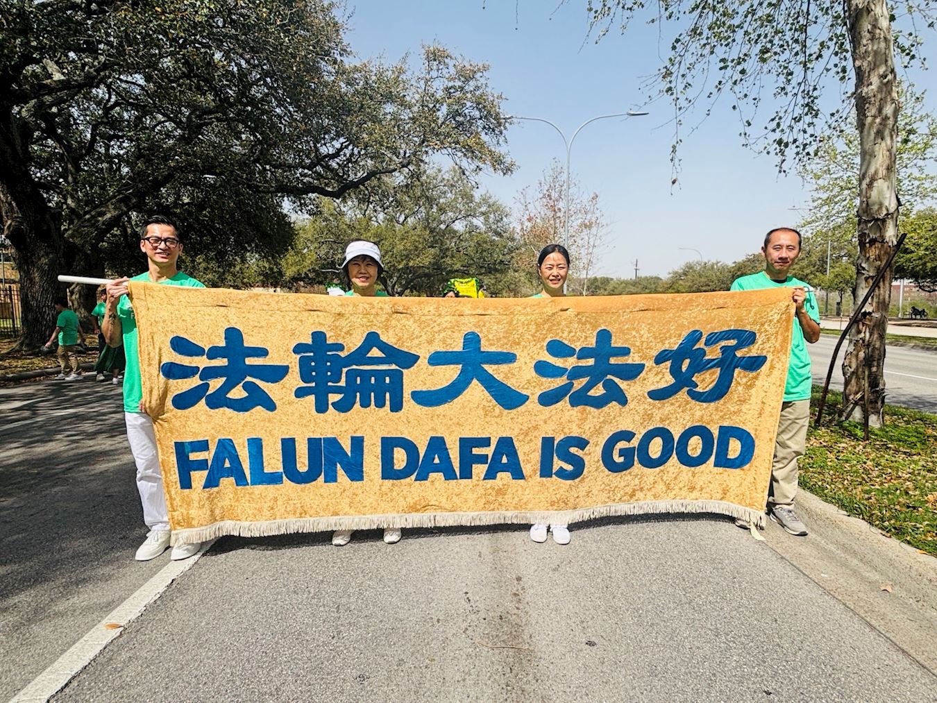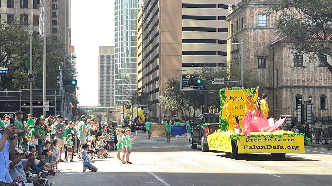 当天中午十二点,游行正式开始。法轮功学员是本次唯一的亚裔团体,他们精心装扮,个个身着绿色衣服或佩戴绿色饰物,喜气洋洋。打头阵的是真相横幅队,三面横幅分别以中英文书写“法轮大法在德州”、“法轮大法好”和“真、善、忍”,展示五套功法的花车紧随其后,腰鼓队演奏的《法轮大法好》、《喜庆》和《新中国进行曲》悠扬悦耳,振奋人心,现场洋溢着祥和与喜悦的气氛。