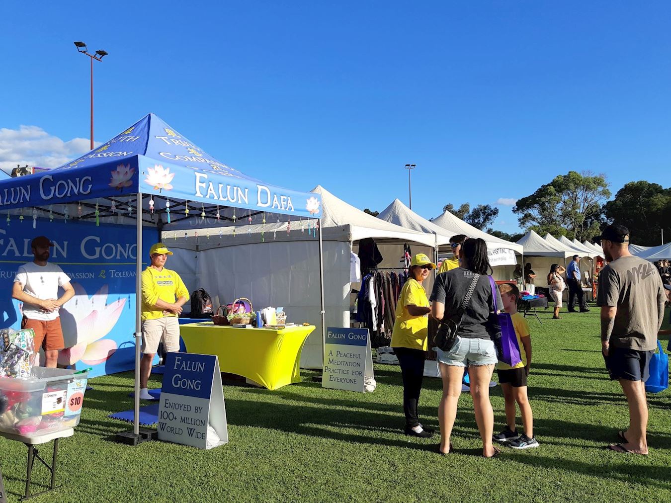 '图1~3:西澳法轮功学员在展位上介绍法轮功,演示五套功法。人们向学员们了解真相。'