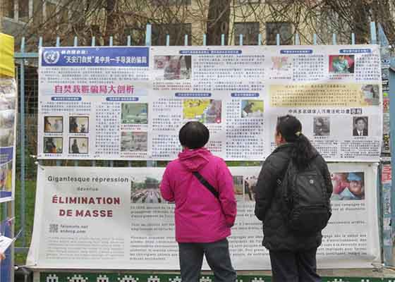 二月二十八日,法轮功学员在巴黎美丽城举行了法轮功功法演示和讲真相的活动。在美丽城地铁站出口不远,挂着醒目的中法文真相横幅。