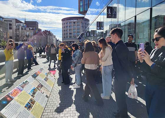 三月二十二日,法轮功学员在比利时布鲁塞尔市中心的繁华街区,举办一场旨在揭露中共迫害的街头活动,吸引了众多行人驻足观看。