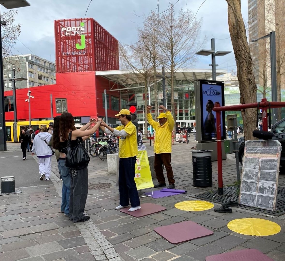 二零二五年三月二十二日,在法国东部穆尔豪斯的学员在当地也进行了讲真相的活动。通过这次活动,许多人了解了中共对中国大陆法轮功修炼人的迫害真相。